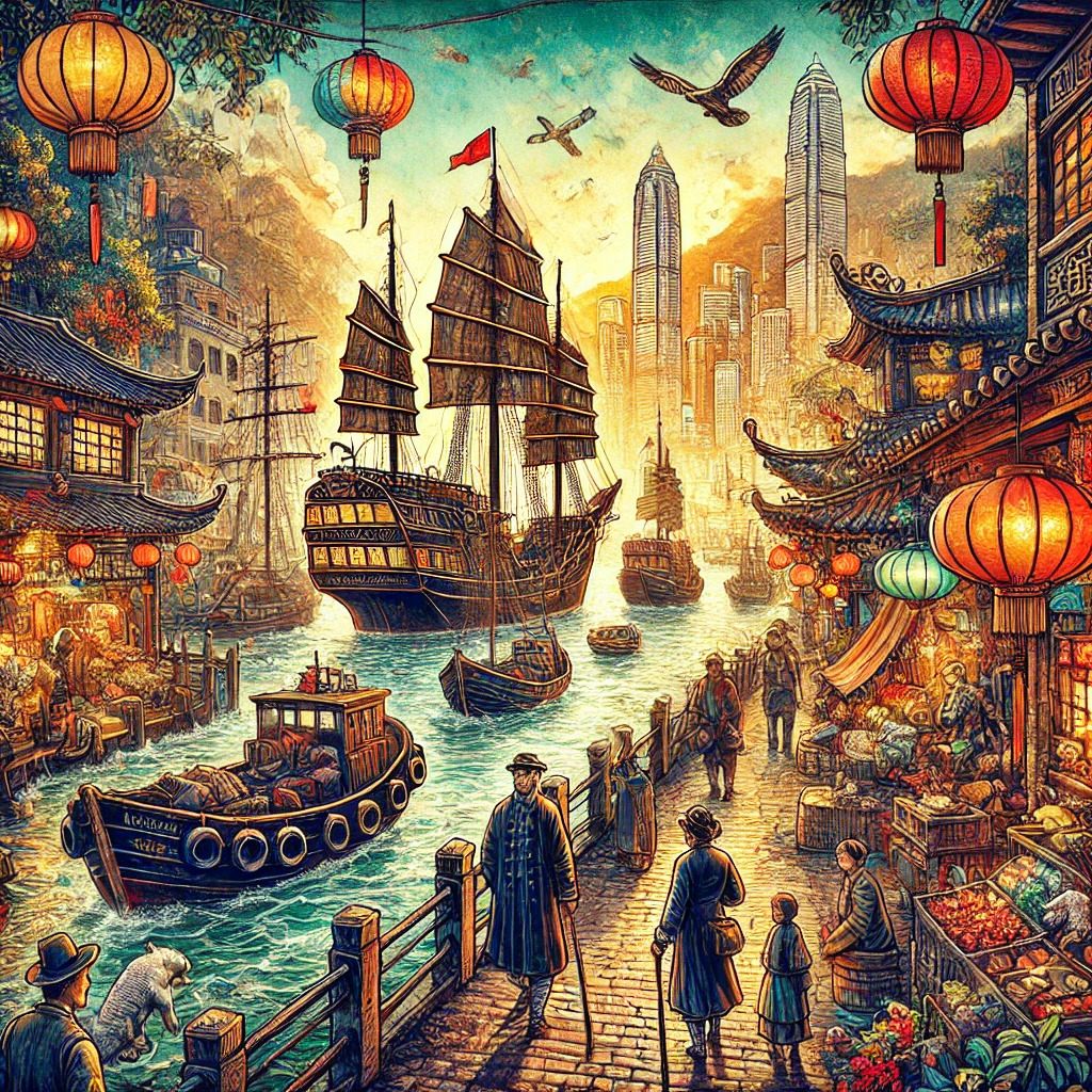 Hong Kong Steampunk – Around the World in 80 Days" is a captivating digital artwork inspired by the fusion of steampunk aesthetics and the exotic atmosphere of 19th-century Hong Kong. This unique piece blends historical elements, steam-powered ships, traditional Chinese architecture, and a touch of retro-futuristic fantasy, creating a visually stunning composition.