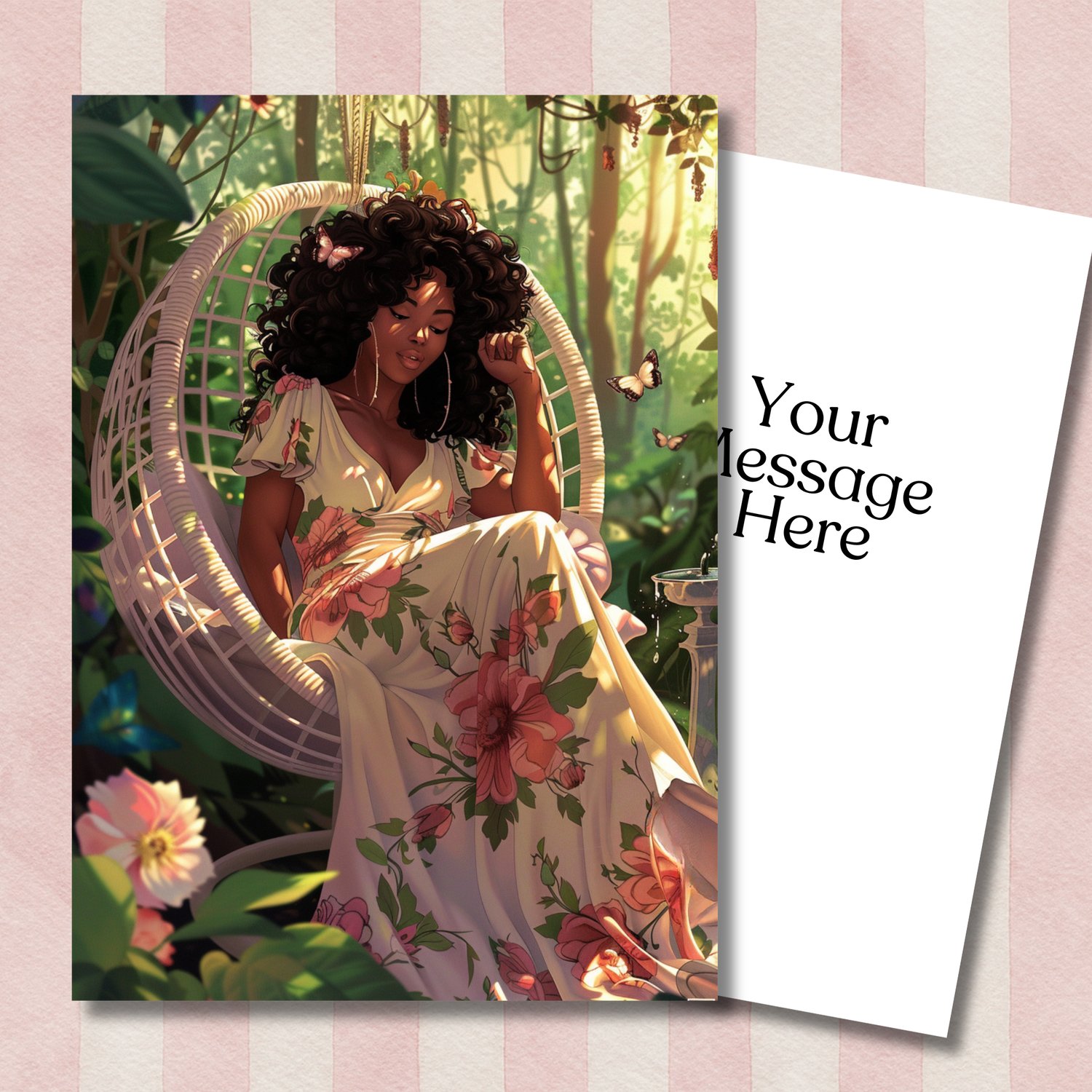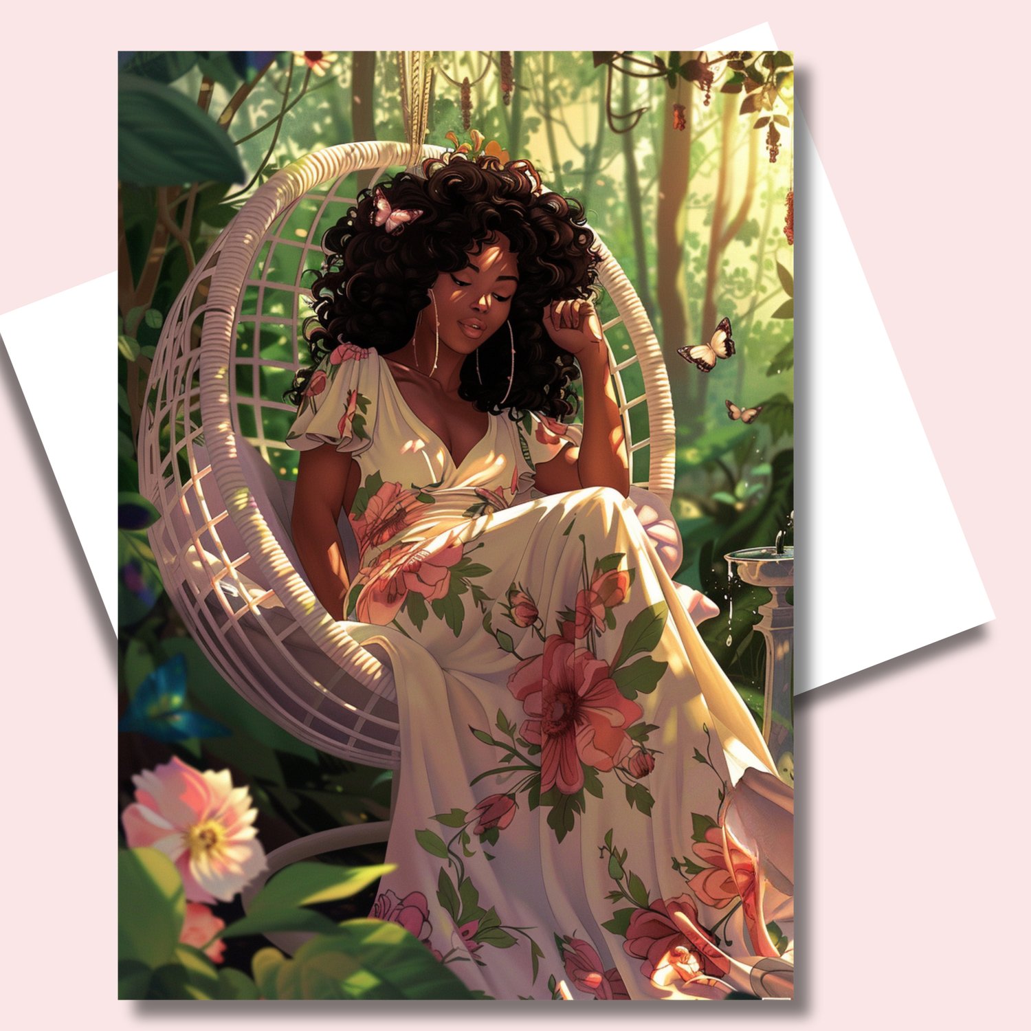 Swinging in the Garden Greeting Note Card | Blank Inside | Black Girl Greeting Card