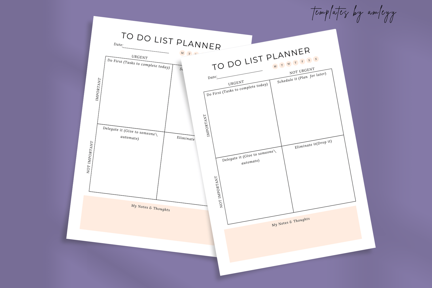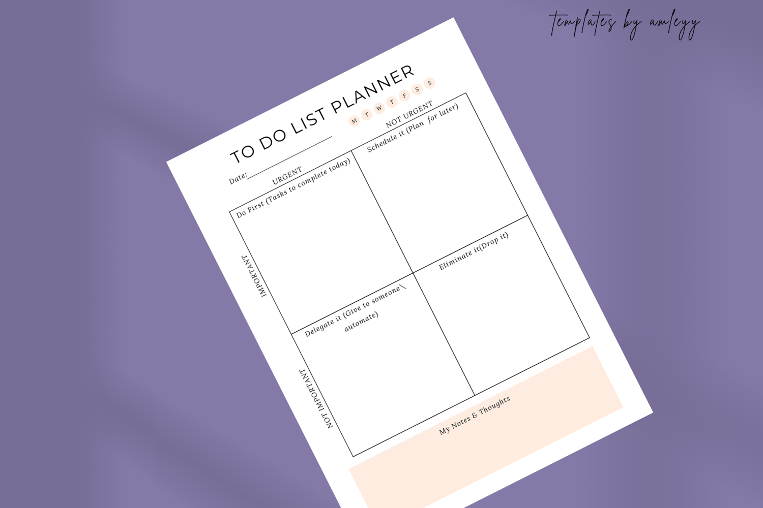 Take control of your time and focus on what truly matters with this To-Do List Eisenhower Box Planner Template – a smart productivity tool based on the Eisenhower Matrix. Perfect for professionals, students, entrepreneurs, and busy individuals, this planner helps you prioritize tasks using the proven urgent-important method.