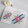 The Lady Jane Quilt Pattern Card is a fully functional quilt pattern and note card in one. Measuring at 5x7 inches it is perfect keep for yourself. There is plenty of space on the inside for pattern notes or fabric swatches.