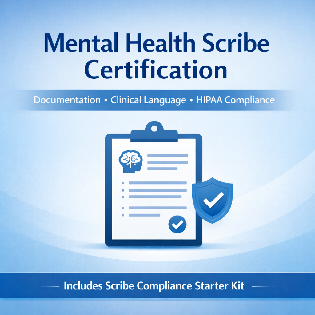 The Mental Health Scribe Certification Program is a practical, real-world training designed to teach you how to confidently support mental health providers through accurate, compliant, and efficient documentation. You’ll learn exactly what a mental health scribe does, including how to manage session documentation using SOAP, DAP, and BIRP notes, and how to navigate both real-time and post-session workflows. The program also walks you through clinical language and documentation standards, helping you master objective vs. subjective writing, avoid bias, and create notes that are clear, professional, and legally defensible.