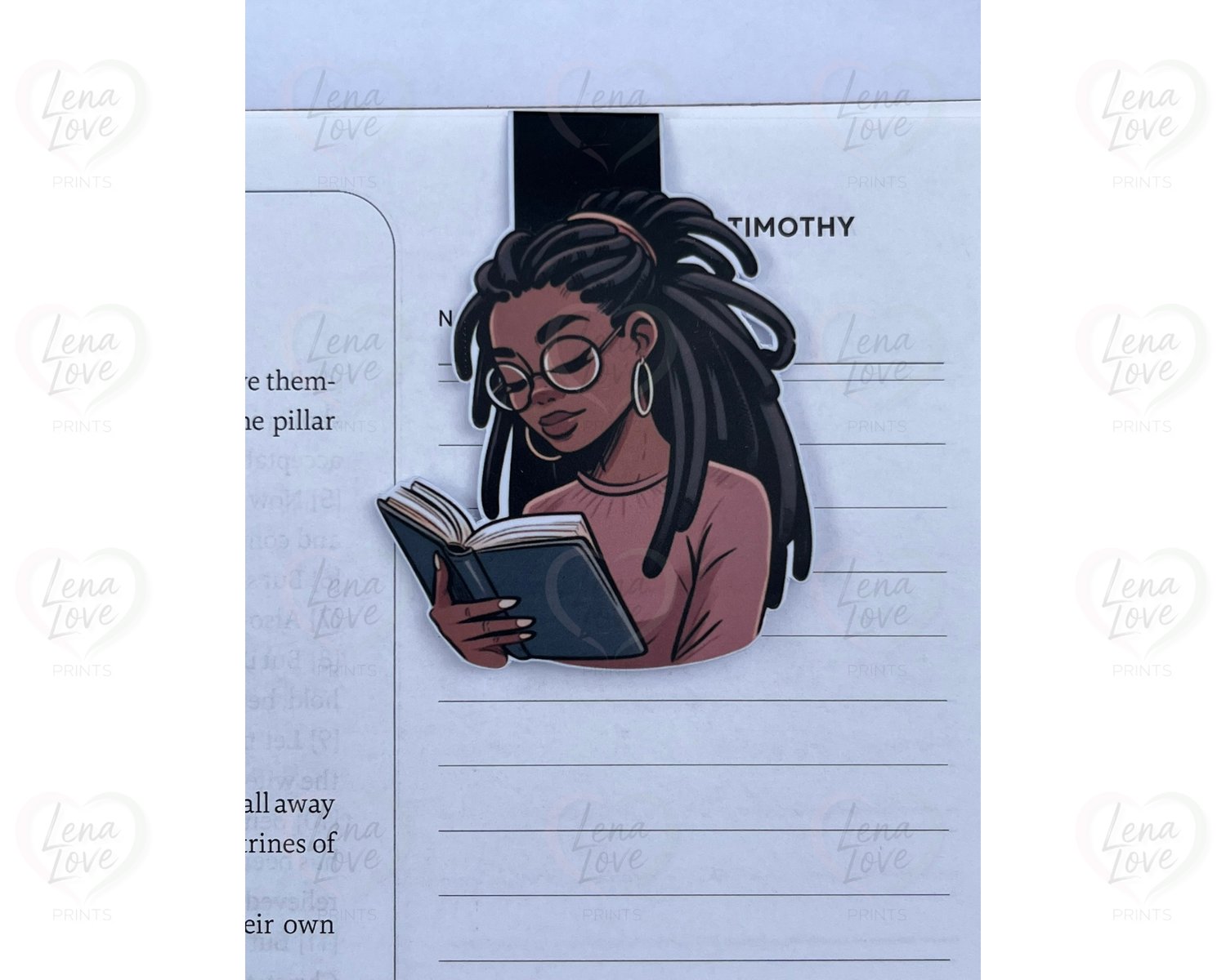 This magnetic bookmark features a beautiful illustration of a Black woman with locs, hoop earrings, and glasses, fully immersed in her book. It’s a celebration of Black beauty, natural hair, and the quiet power of reading. Made with sturdy cardstock and strong magnets, it clips securely to your page without slipping or tearing, making it perfect for bookworms, journal lovers, and planner enthusiasts alike.