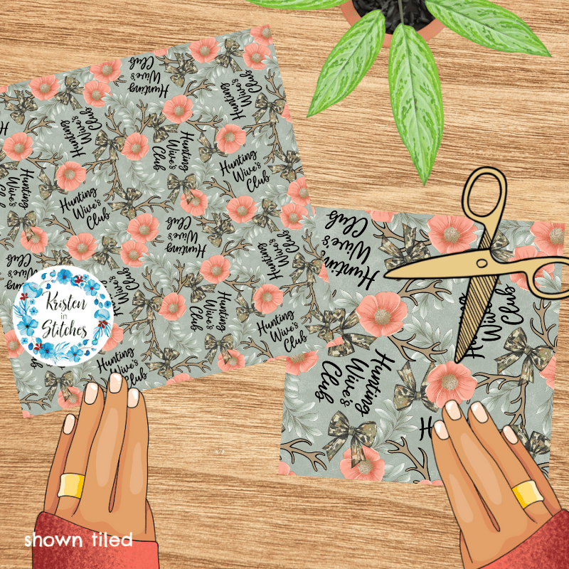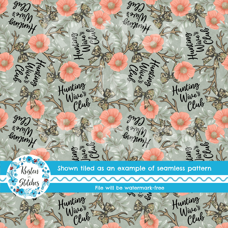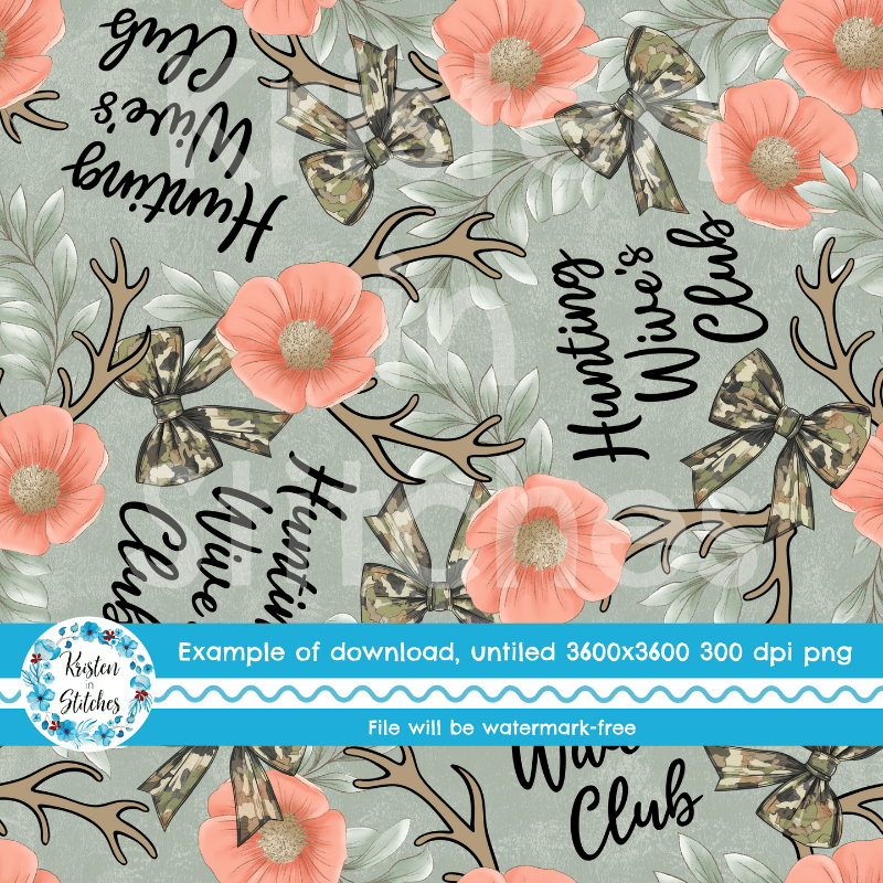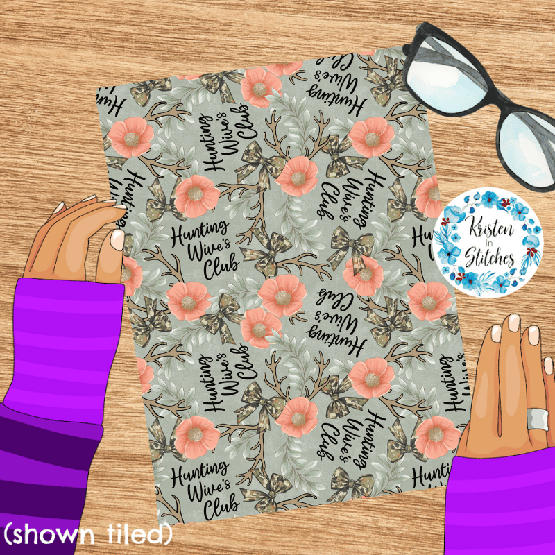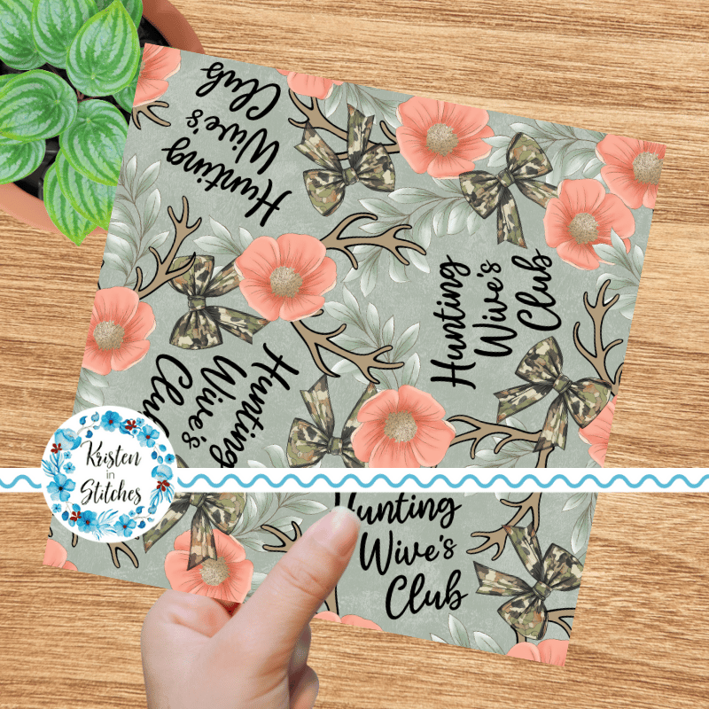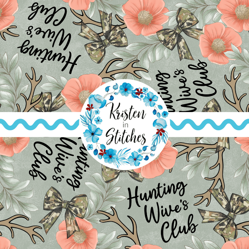 Inspired by the Hunting Wives series, featuring camo bows, deer antlers, and coral flowers on sage green.
