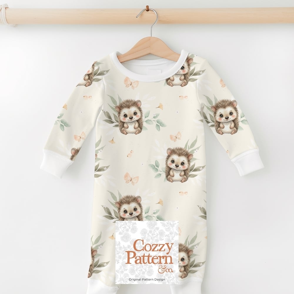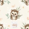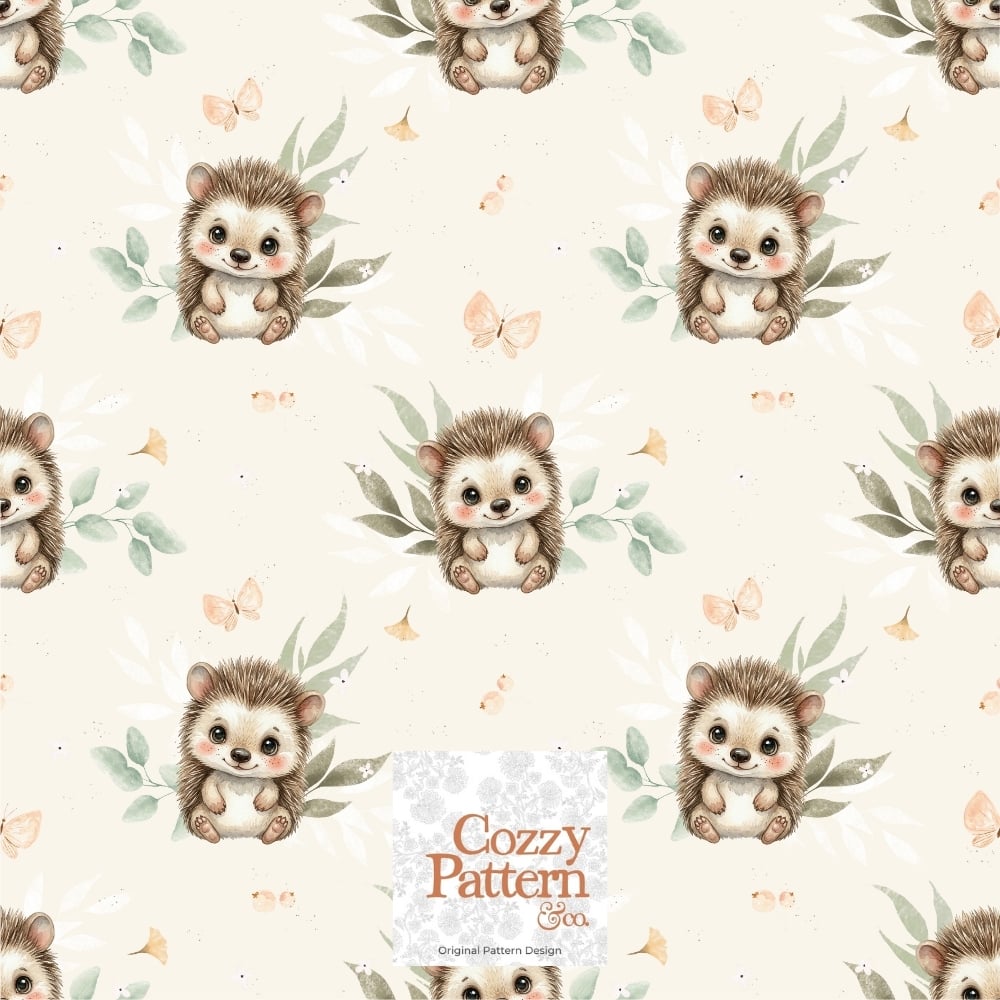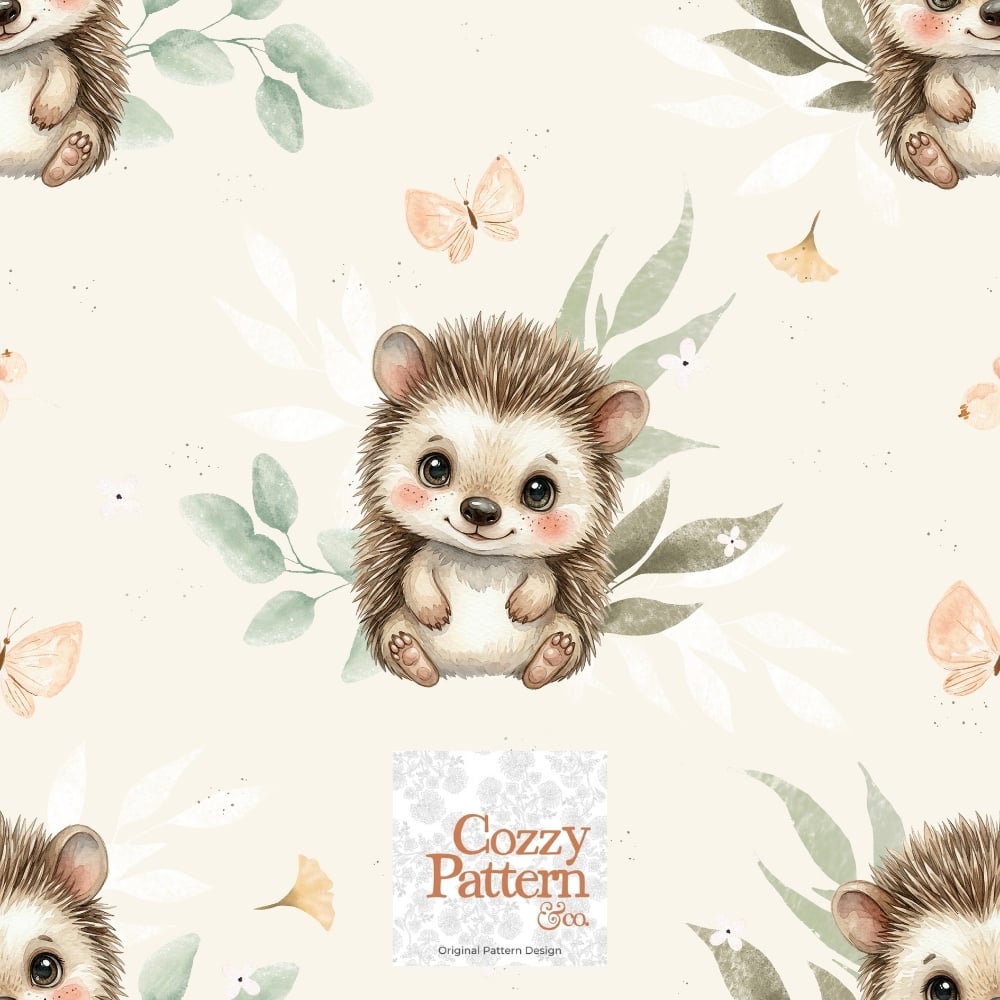 Create soft and heartwarming baby and nursery projects with this seamless hedgehog pattern featuring an adorable little hedgehog surrounded by delicate leaves, butterflies, and subtle forest elements.