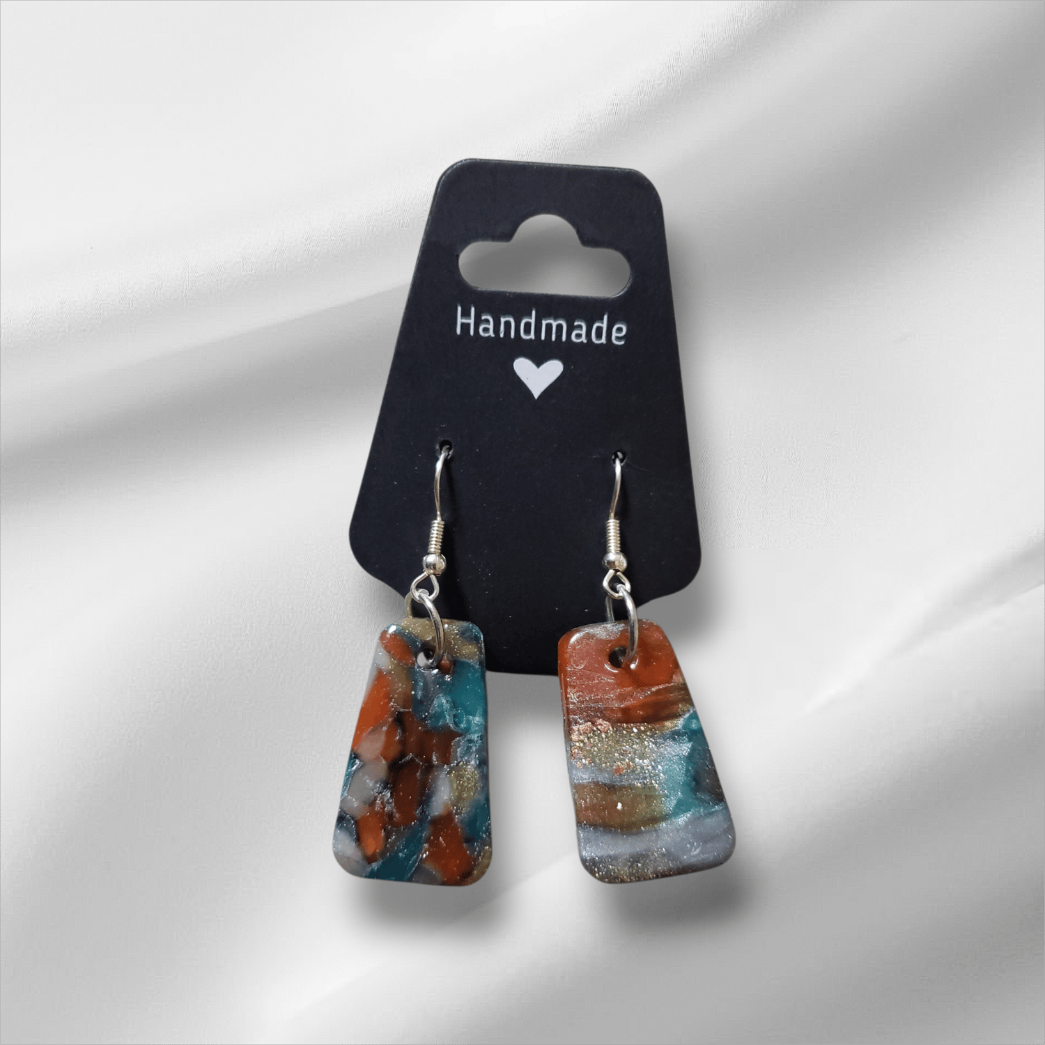 These stunning handmade earrings are crafted from polymer clay to mimic the look of natural stone, blending deep orange, vibrant turquoise, and shimmering gold for a bold, earthy aesthetic. Each pair is one of a kind, with swirling, marbled patterns that make every set uniquely beautiful. Lightweight and eye-catching, they're finished with hypoallergenic posts for sensitive ears. A limited-edition accessory that brings a rich, artistic touch to any outfit.