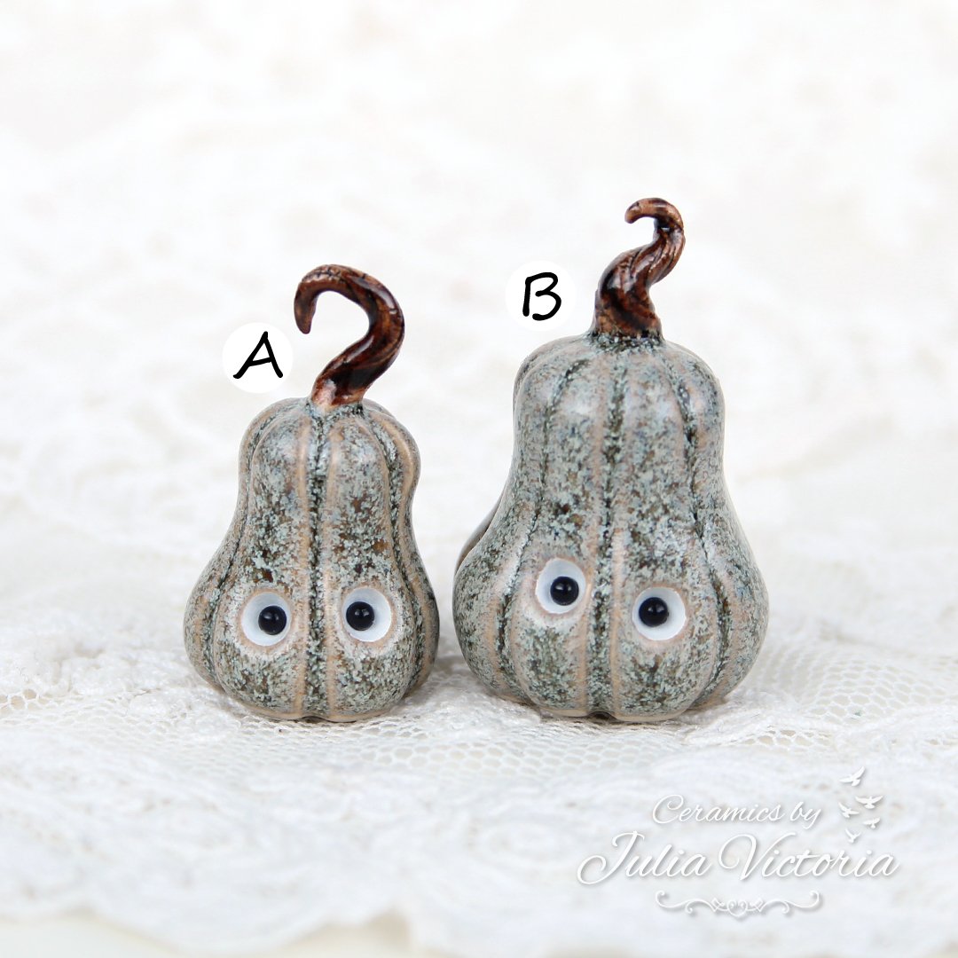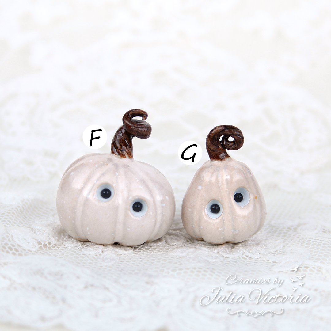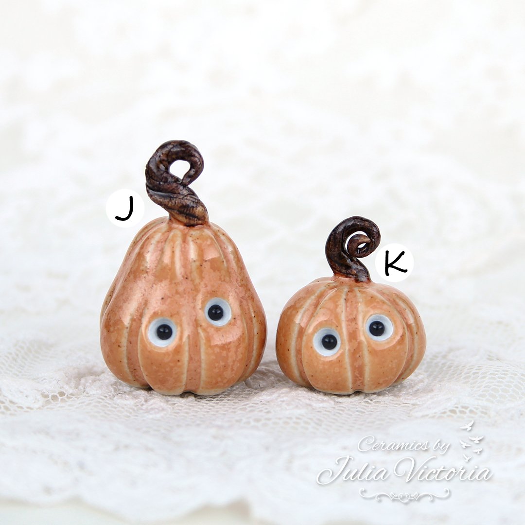 These cute little pumpkins are looking for a new home. They are hand-sculpted in ceramics, glazed and painted by me