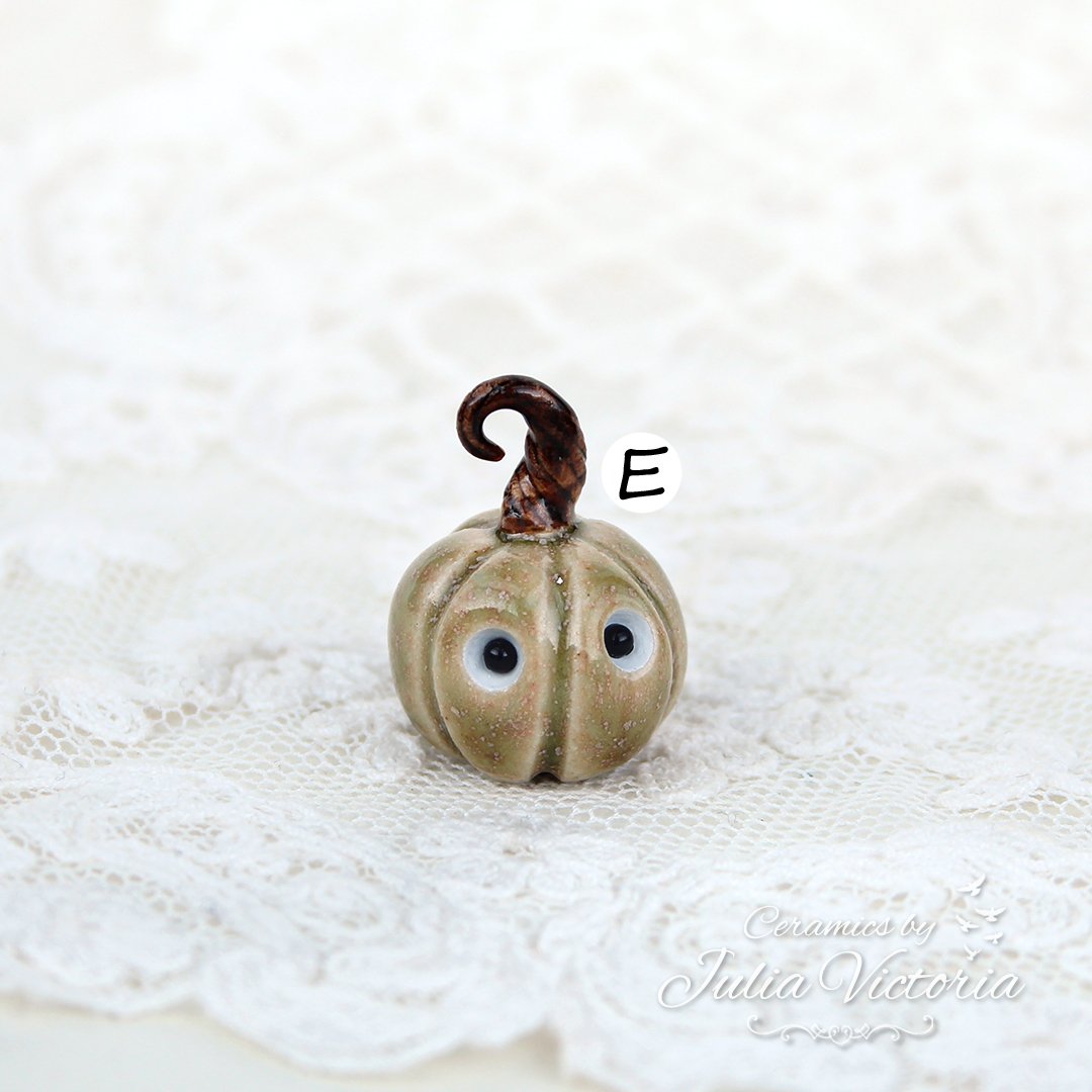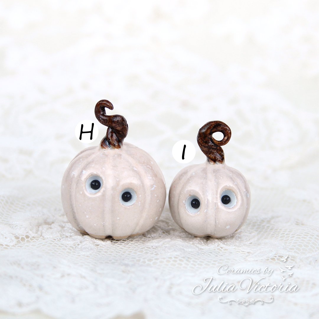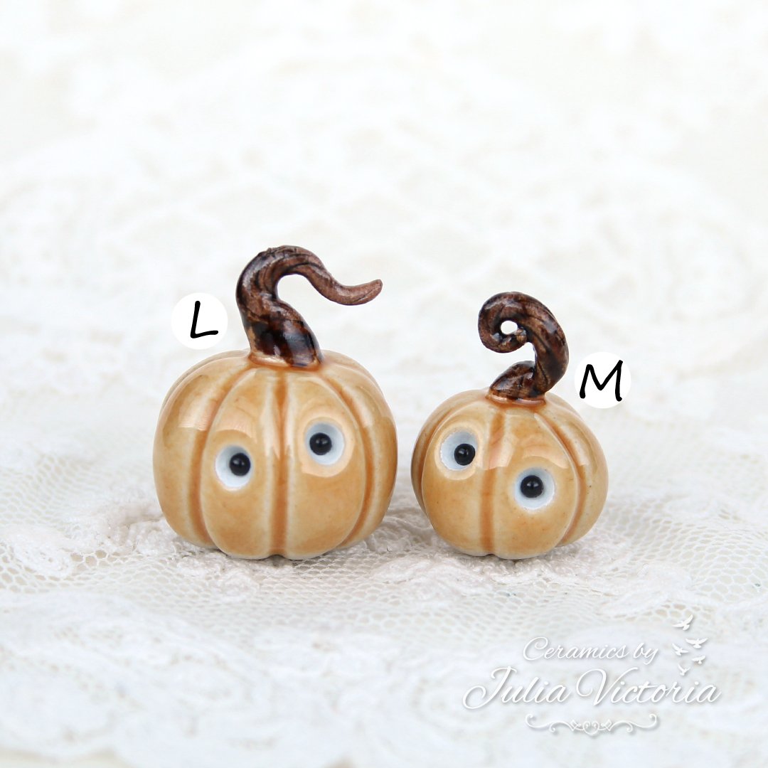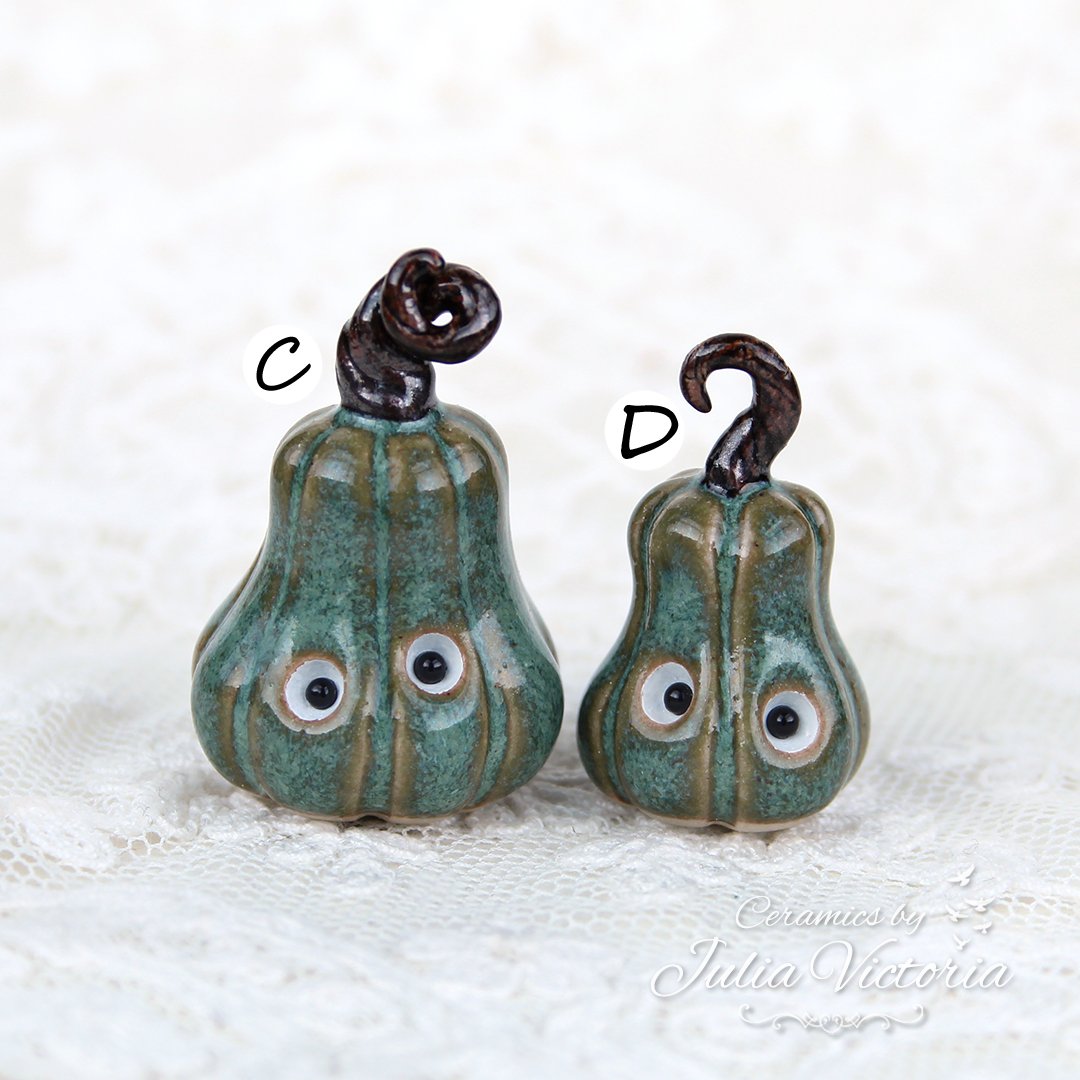 These cute little pumpkins are looking for a new home. They are hand-sculpted in ceramics, glazed and painted by me