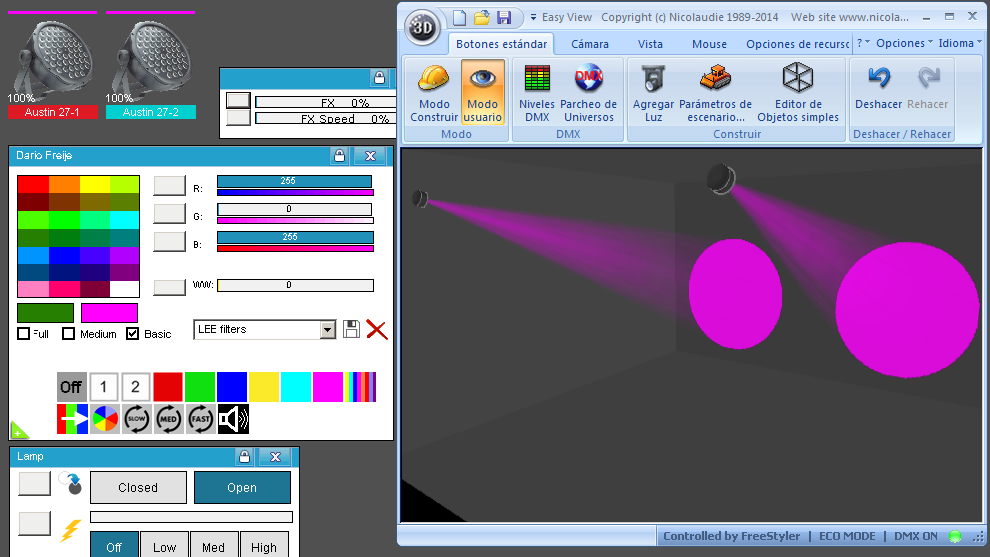 Esta Librería SSL2 está optimizada para trabajar con Magic 3d Easy View. Es decir para ver una representación 3D de las secuencias que estemos realizando con Freestyler, QLC+ o cualquier otro soft que se conecte con Magic 3d.
