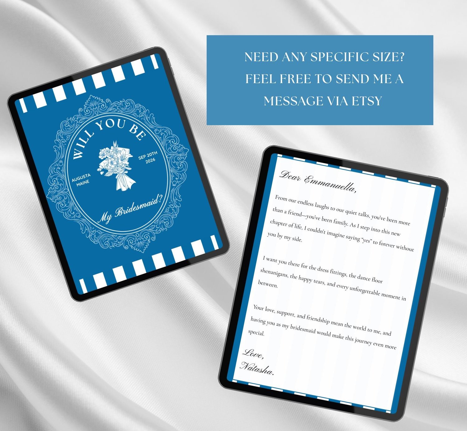 Easily edit the template in Canva to personalize names, dates, and locations — no design skills needed! Perfect for brides who want to create a memorable “Will You Be My Bridesmaid?” moment that feels both sophisticated and heartfelt.