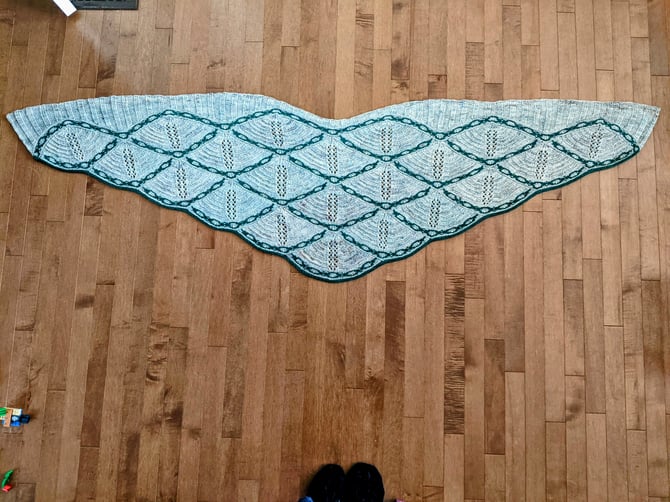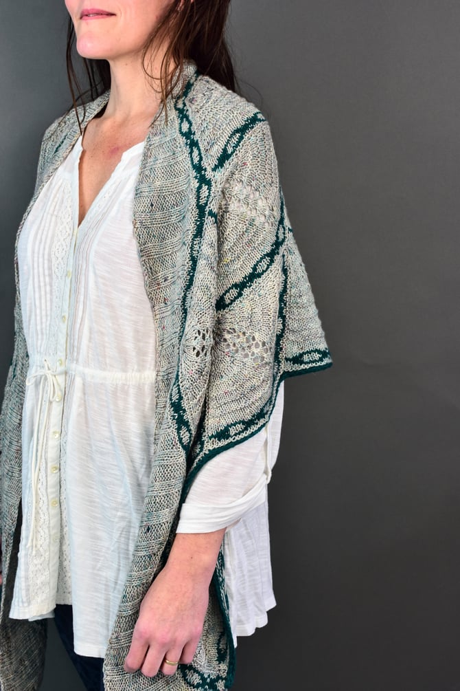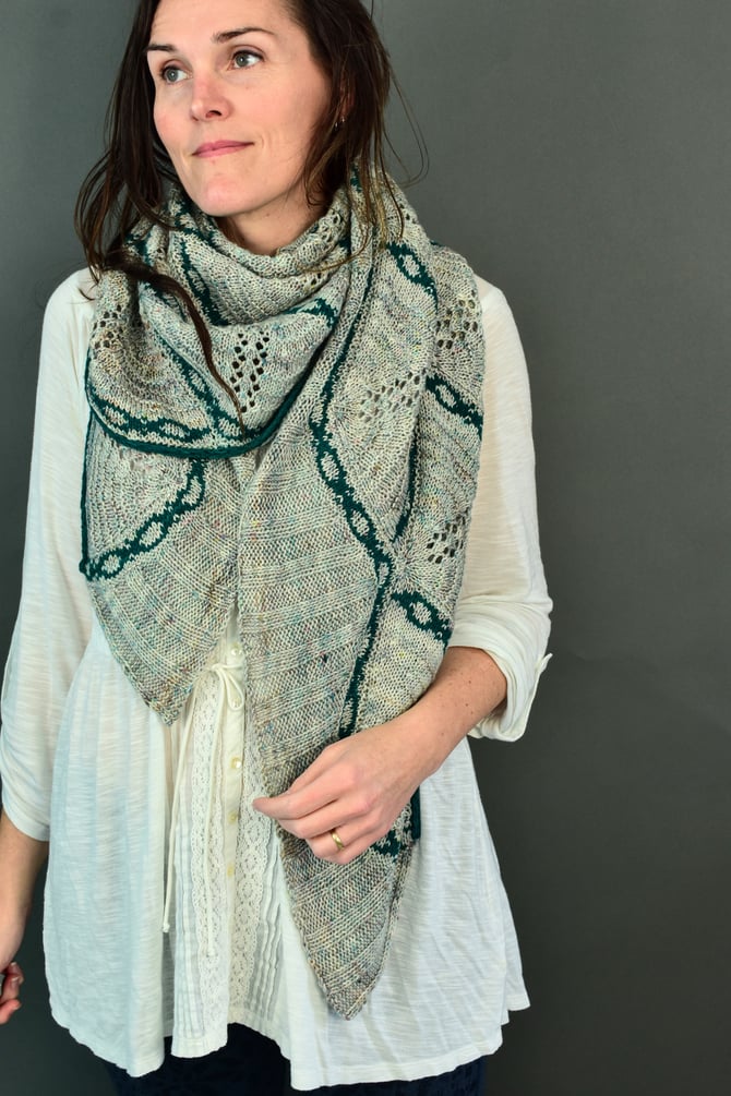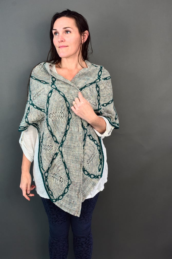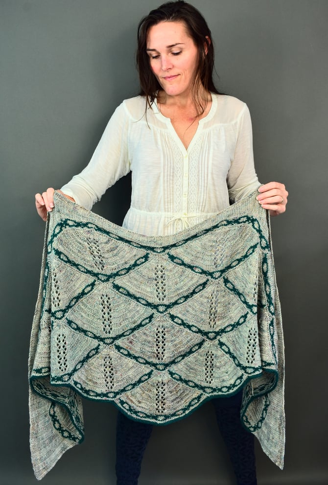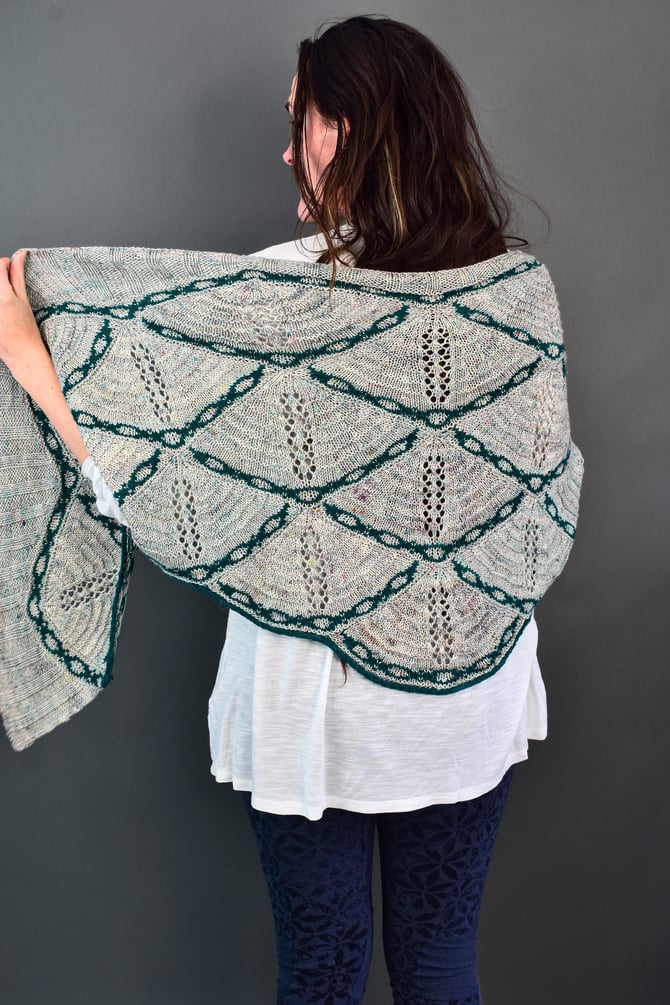 Chain Lakes is a generously large shawl, with striking colourwork and dashes of easy lace chained together in a modular construction. There is a nice little dip in the neck from the resulting construction to cozily nestle onto your shoulders.