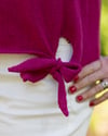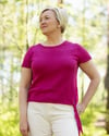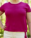 Solmu is a short-sleeved, slightly loose summer shirt with a knot detail at the waist. The sample shirt is knitted from silk yarn, but the design is also suitable for other materials.