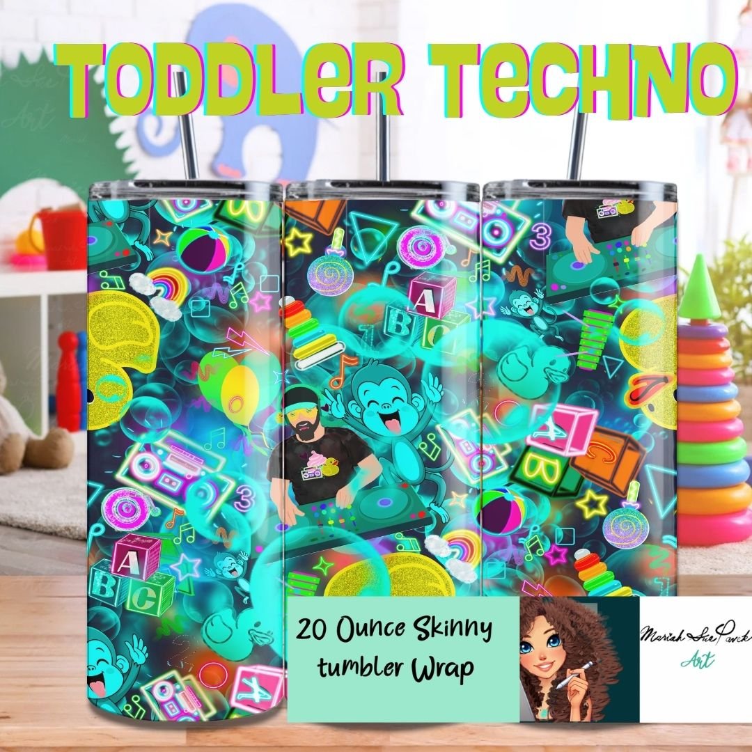 300 DPI) digital design features a DJ dropping beats, cheerful monkeys, glittery rubber ducks, balloons, and neon stars and blocks in electric blues, pinks, yellows, and greens against a cosmic dark backdrop. Perfect for toddler room decor, custom tees, or playful fabric projects, this pattern blends high-energy tech flair with kid-safe charm. Tell me you’re a toddler mom who’s had toddler techno on repeat all week without telling me—because this design has that wild, dance-party energy! Download includes PNG (transparent) and JPG files, ideal for personal or commercial use (up to 500 physical products). Get your little one grooving with this tumbler masterpiece!