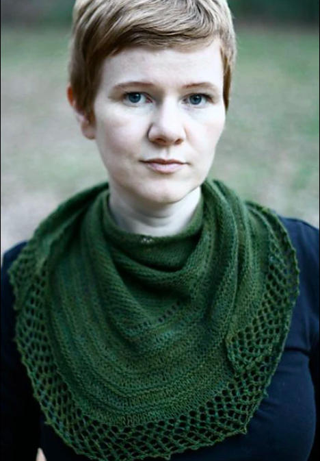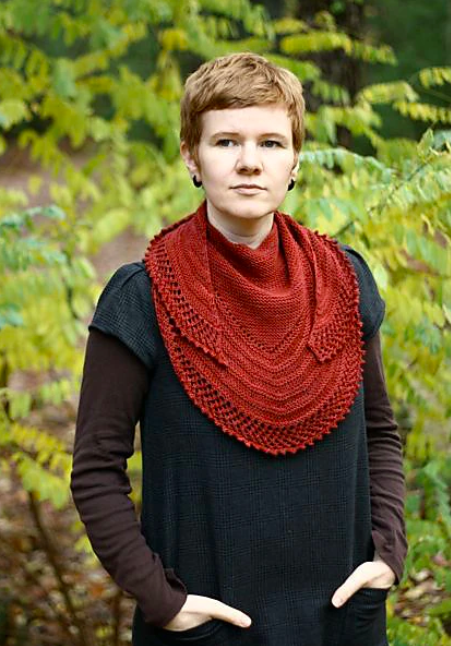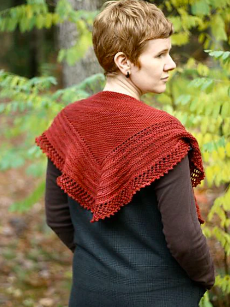 This shawl begins with a Shetland construction method to create the center triangle. Stitches are then easily picked up from the yarn over loops that are formed down two sides. The rest of the shawl is worked outwards in a semi-circular construction using two different sized needles to create a simple and fun stitch pattern. The shawl is then finished with a little bit of lace and a picot bind off.