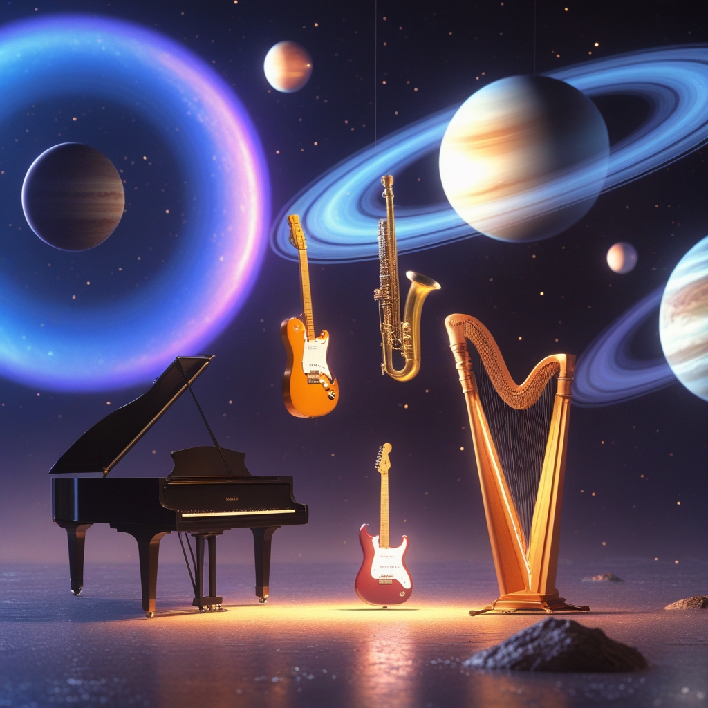 Render a stunning, ethereal scene featuring a variety of music instruments suspended in mid-air, set against a breathtaking celestial backdrop of vibrant, glowing planets, their rings and atmospheres luminous in shades of blue, purple, and gold, with a warm, soft light illuminating the instruments, including a grand piano, a sleek electric guitar, a vintage trumpet, a majestic harp, and a few more, each with intricate details and textures, while the planets, ranging in size and distance, display distinct characteristics, such as Saturn's prominent ring system, Neptune's icy blue hue, and a smaller, rocky planet in the foreground, with subtle, shimmering starlight adding depth and magic to the overall composition.