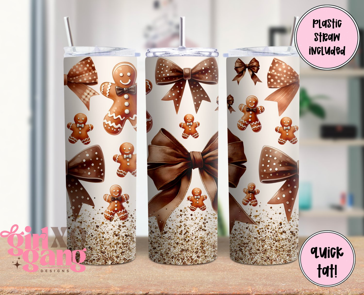 Gingerbread coquette faux glitter 20 oz tumbler with plastic straw