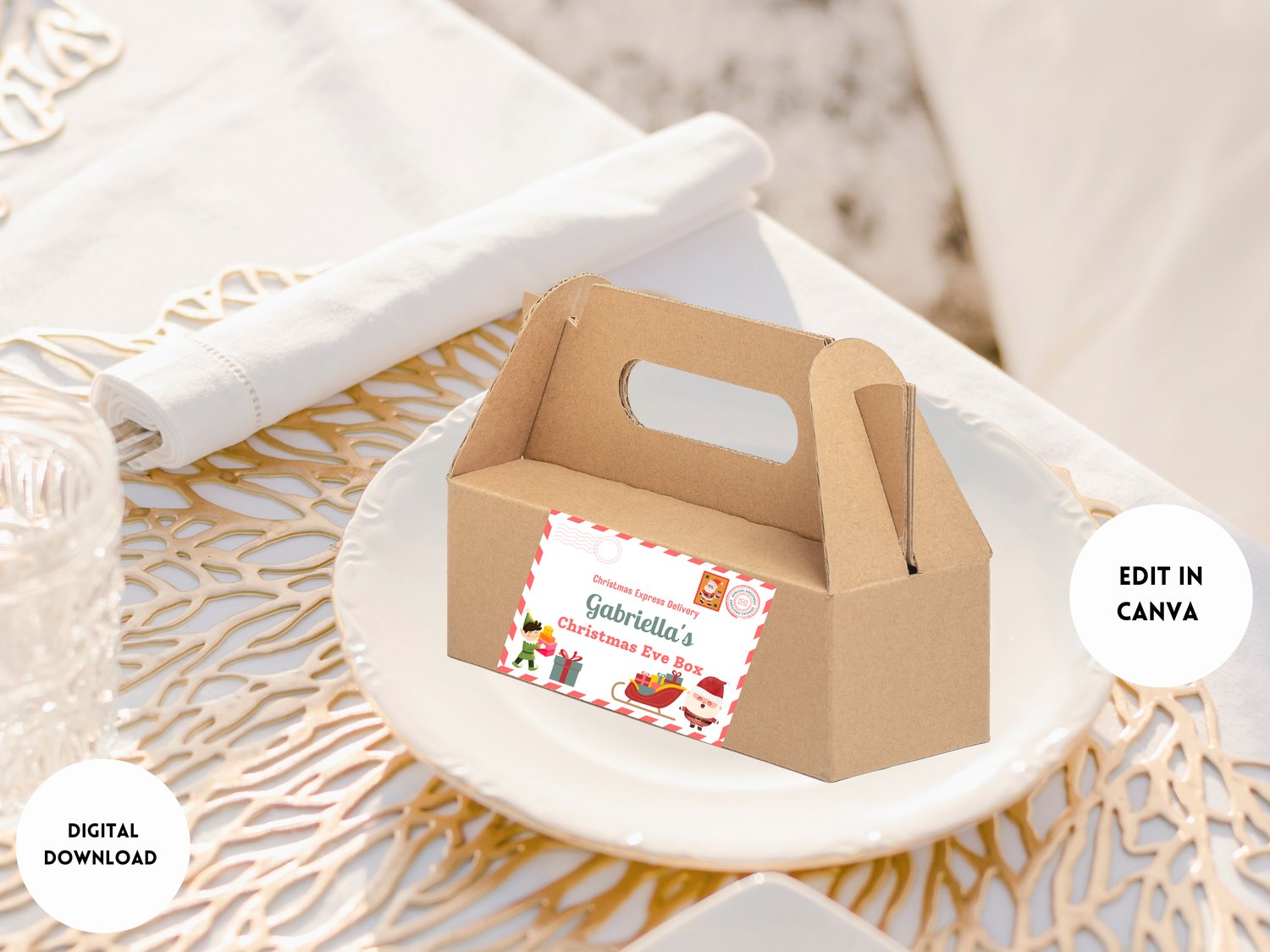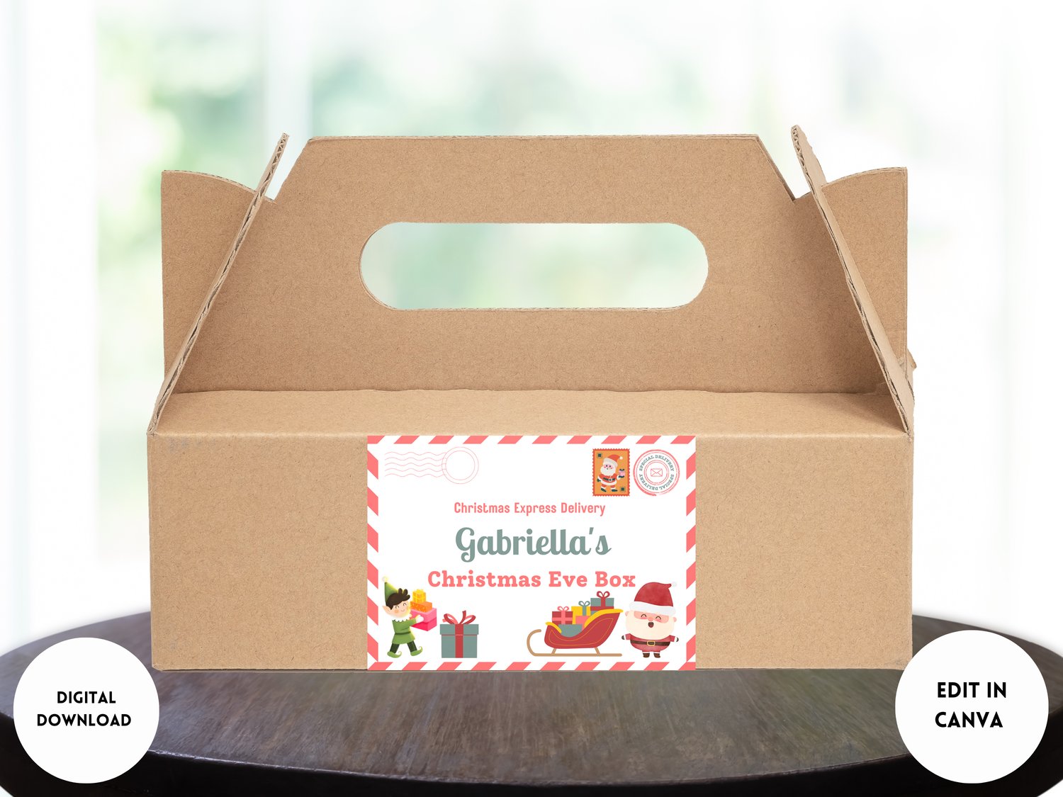 Christmas Eve Box Label | Santa's Express Delivery | Xmas Gable Carry-on Sticker | Canva Template | Printable Green And Red Paper Stationery