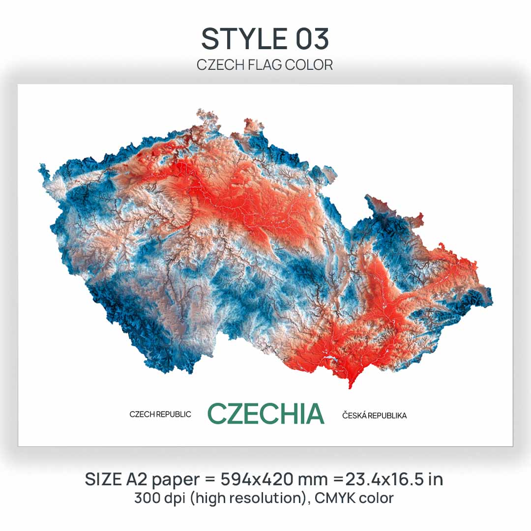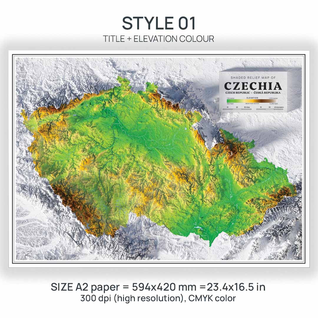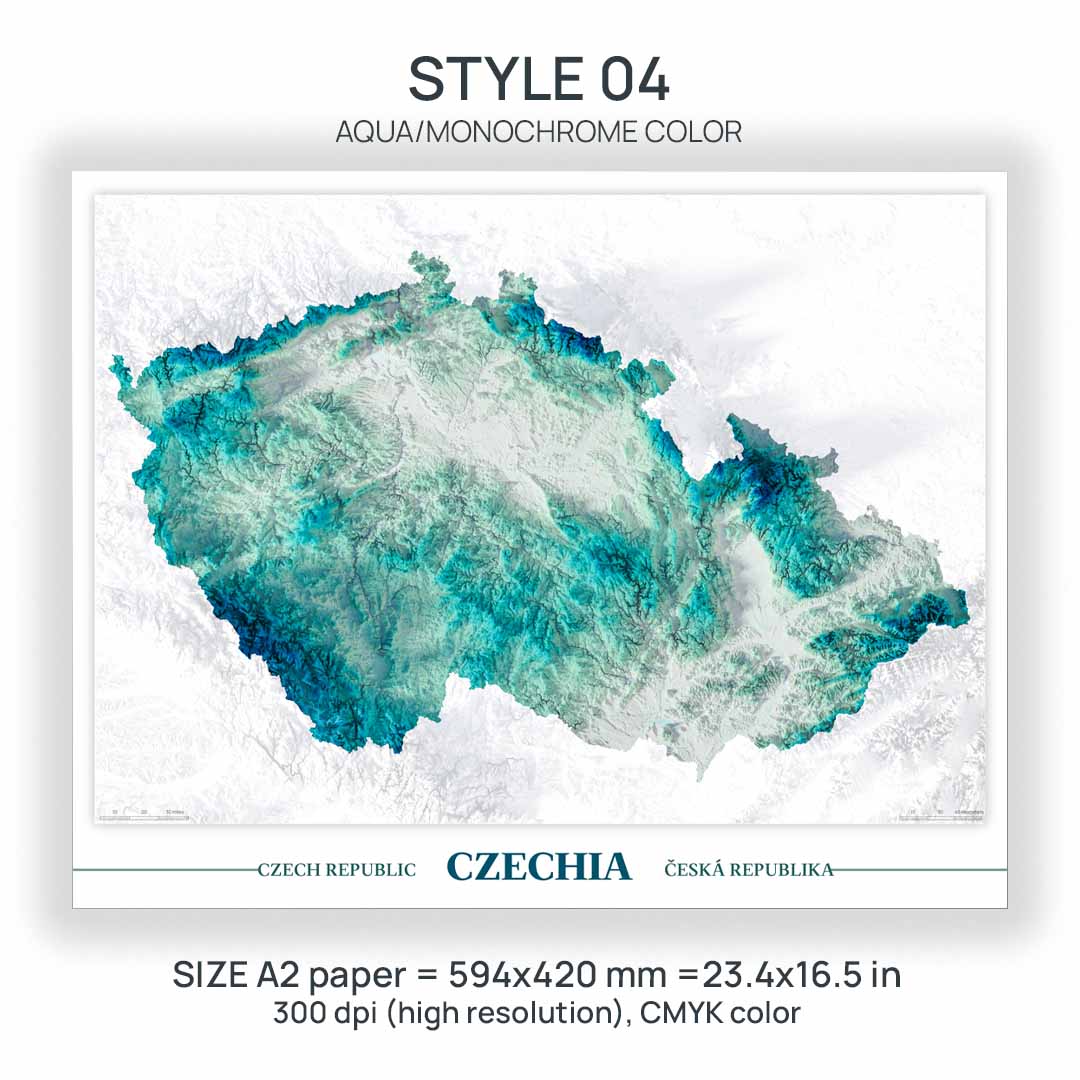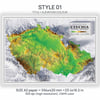 CZECHIA Czech Republic Ceska relief maps, printable, A2 paper size, 23.4x16.5 in, 300 dpi, 4 styles