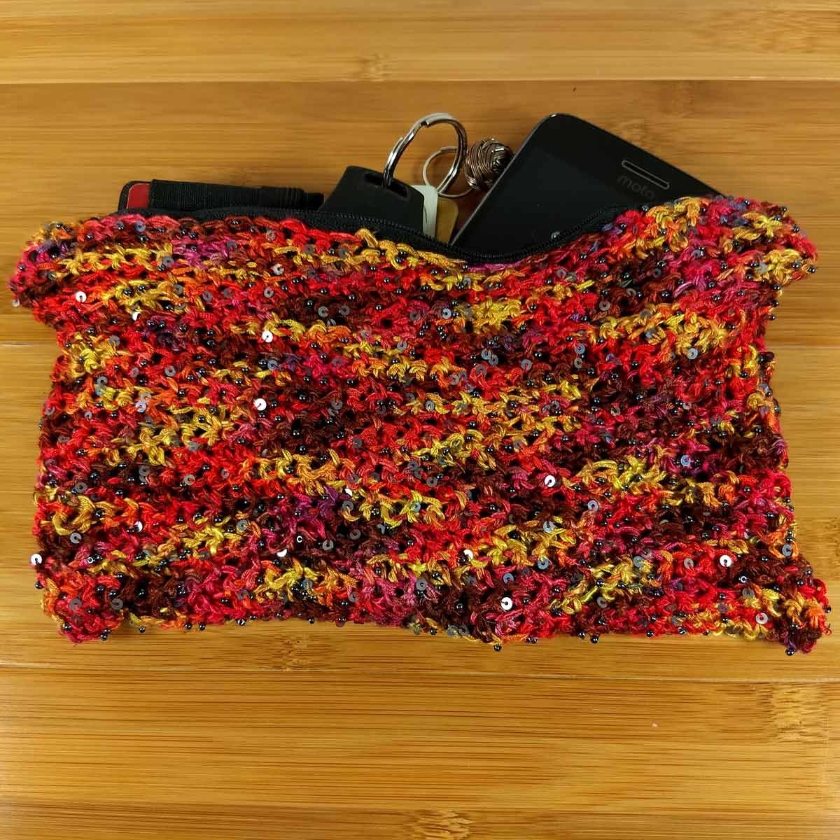 This quick to crochet pouch can store your essentials in style and sparkle when you’re off to yet another holiday soirée.
