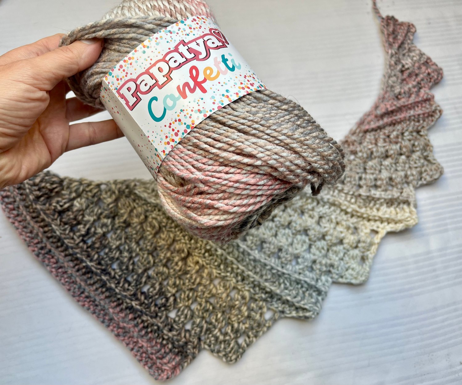 Tento šátek je navržen pro všechny, kteří milují hravost a chtějí svůj šatník oživit kouskem, který nikdo nepřehlédne. Při tvorbě šátku Confetti jsem vsadila na dynamickou asymetrii a bohatou texturu. Šátek začínáme háčkovat od cípu a postupně jej rozšiřujeme pouze na jedné straně, čímž vzniká moderní a velmi praktický tvar. Hlavní hvězdou je zde plastický reliéfní vzor – promyšlená kombinace dlouhých sloupků a nadýchaných Puff sloupků („puffíků“), které šátku dodávají měkkost a hloubku.