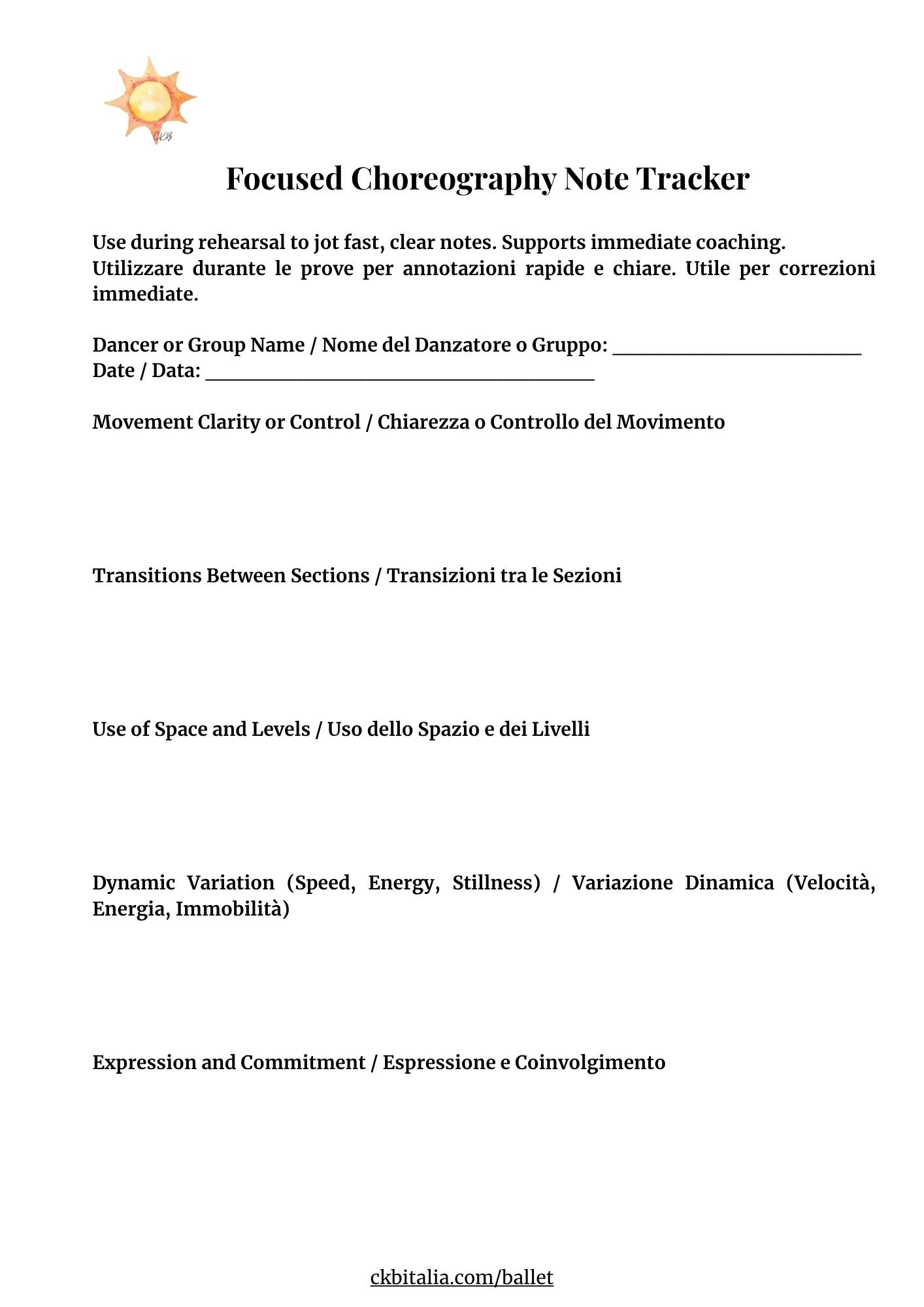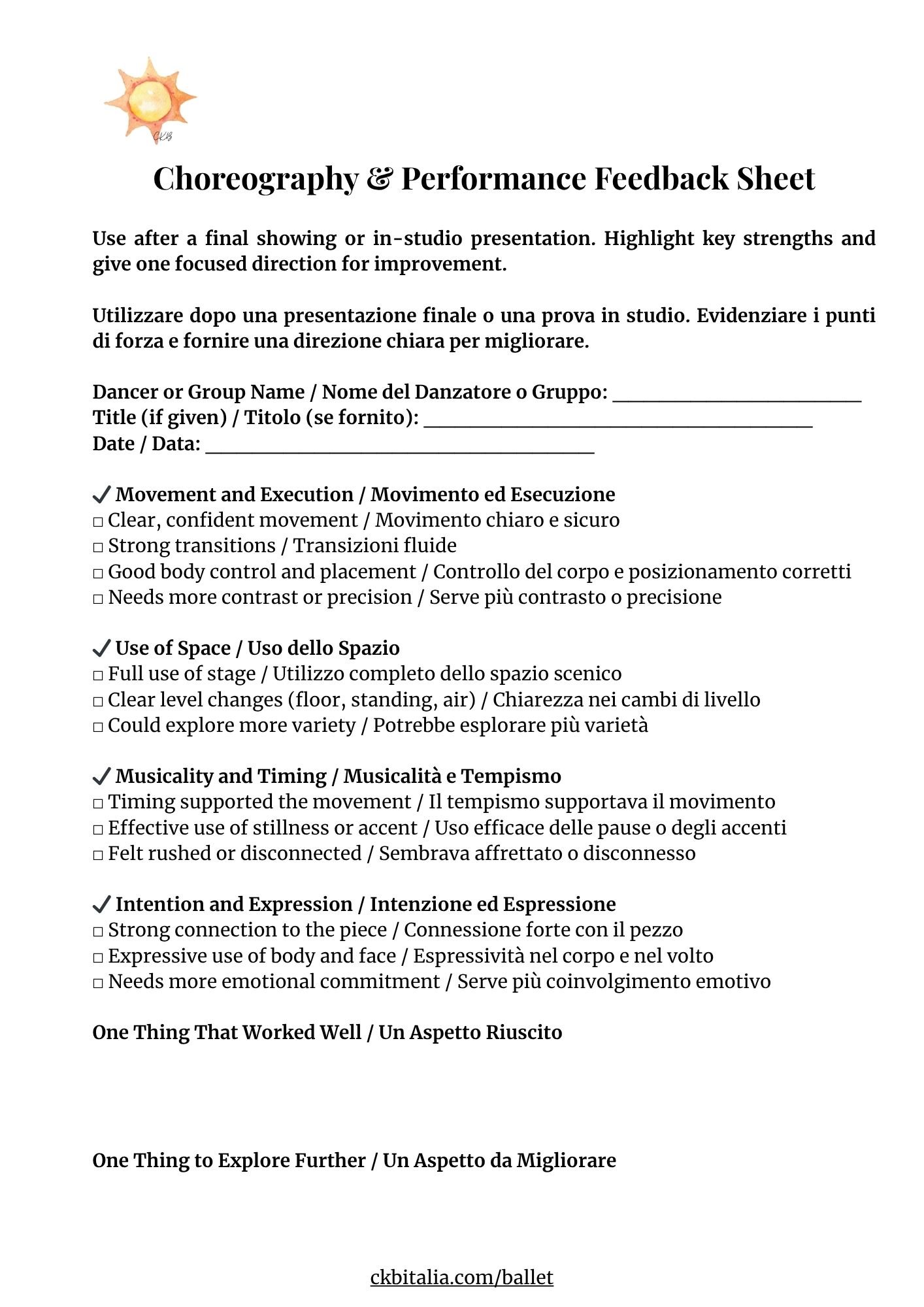 CKB Choreography Feedback Toolkit Clear, Printable Observation Tools for Dance Teachers (EN + IT)