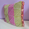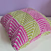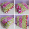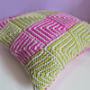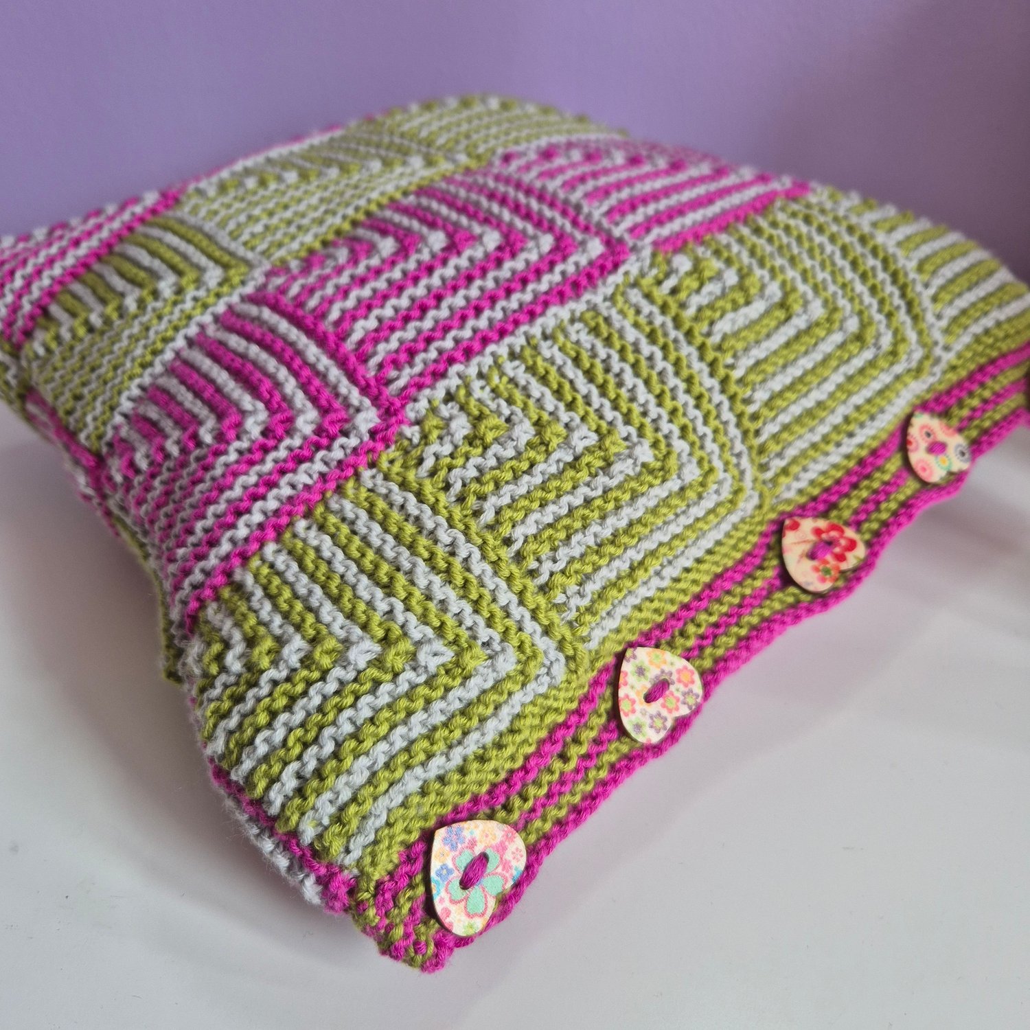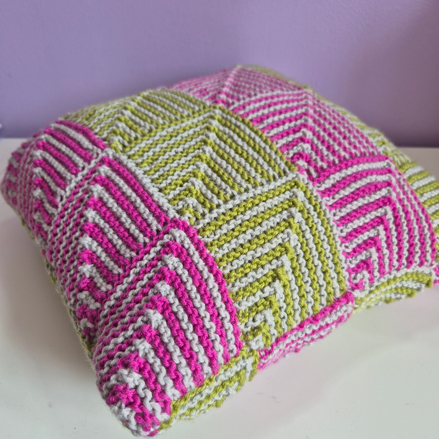 Fabulous and fun to knit cushion which consists of mitred squares which are joined as you go. Use as many colours a you want.