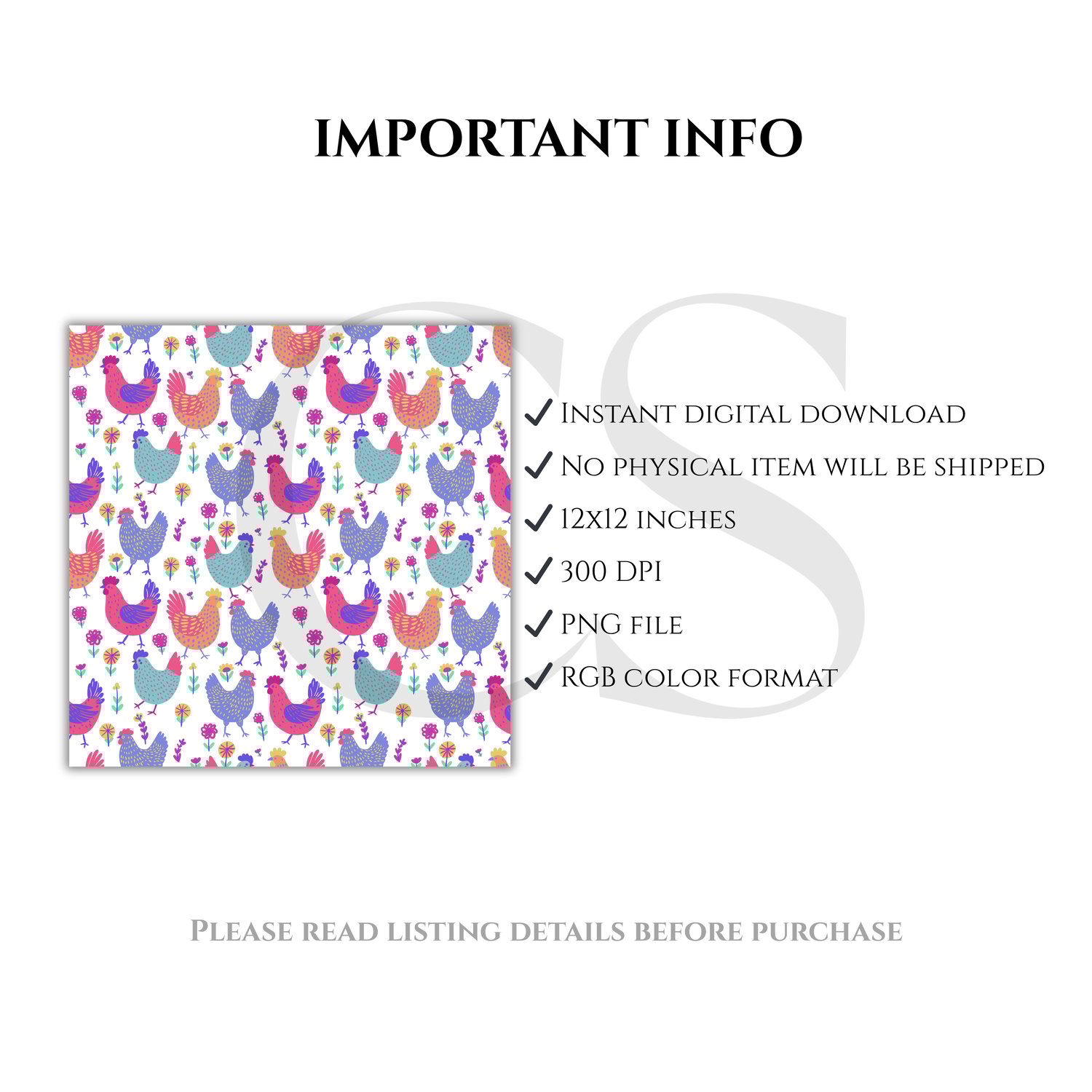 Rooster Seamless Pattern PNG, Farmhouse Chicken Pattern, Cottagecore Floral Rooster Design, Spring Digital Paper, 12x12 Repeat
