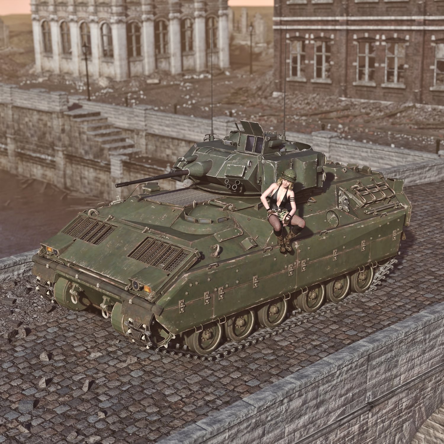 Famous American armored vehicle, providing troops with decent protection and a serious fire support. Used in various battle zones around the world. Sturdy, trustful and good looking :) Includes a rigged turret on top that can be hidden if not needed. Also includes a rocket launcher that can be articulated. Hatches rigged too for more realistic pictures.