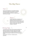This gentle and easy to follow guide is perfect for anyone wanting to understand their birth chart without feeling overwhelmed. Inside you’ll find clear explanations of the zodiac signs, the twelve houses, the planets and the Big Three, along with the north and south nodes and the meaning of retrogrades. Each section is simple, supportive and written to help you make sense of your unique astrological blueprint.