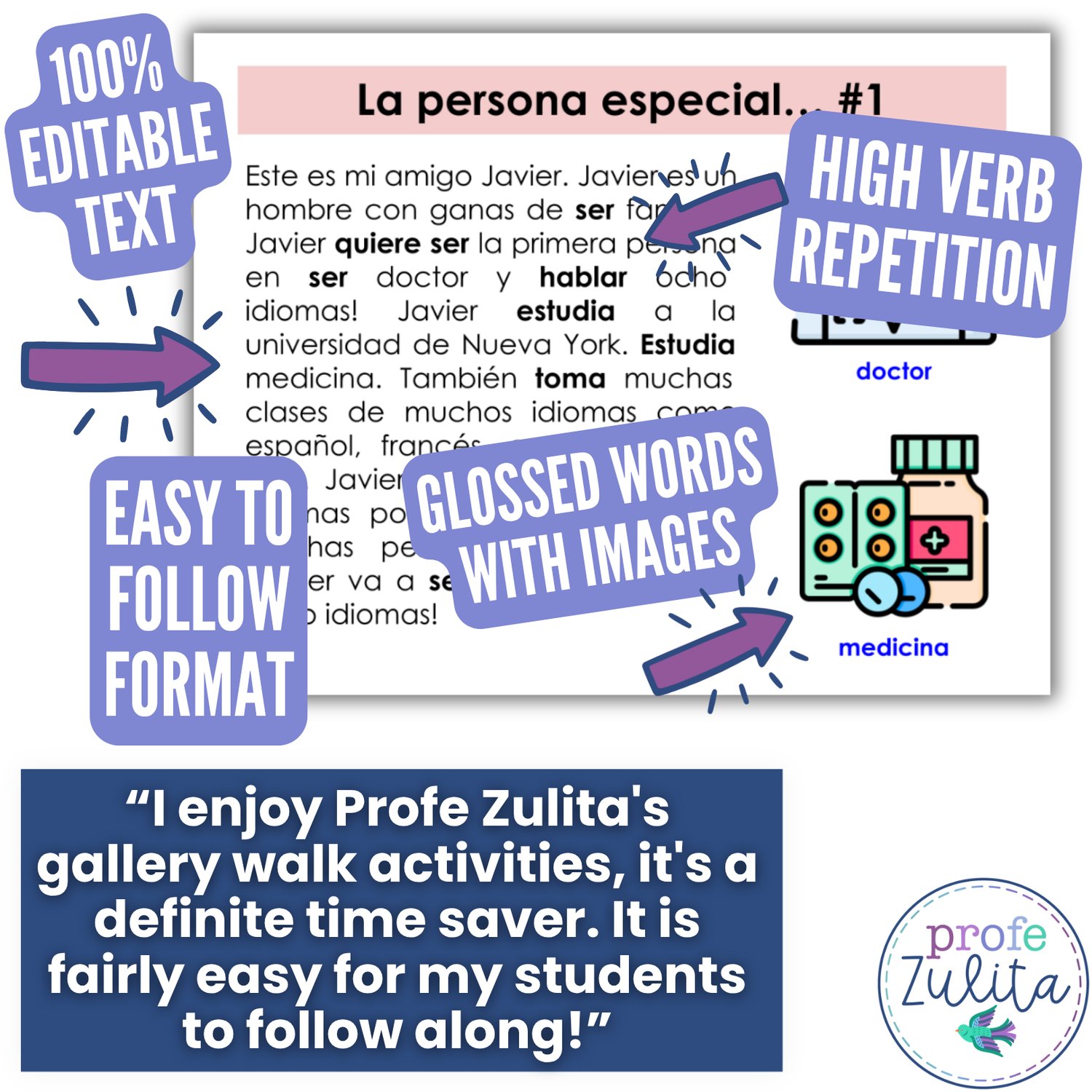 These texts work great as a Gallery Walk. Personally I use it in my Level 1 classroom - but check out the preview to see what works for you! The text of this gallery walk is editable after making a copy to level it up or down!