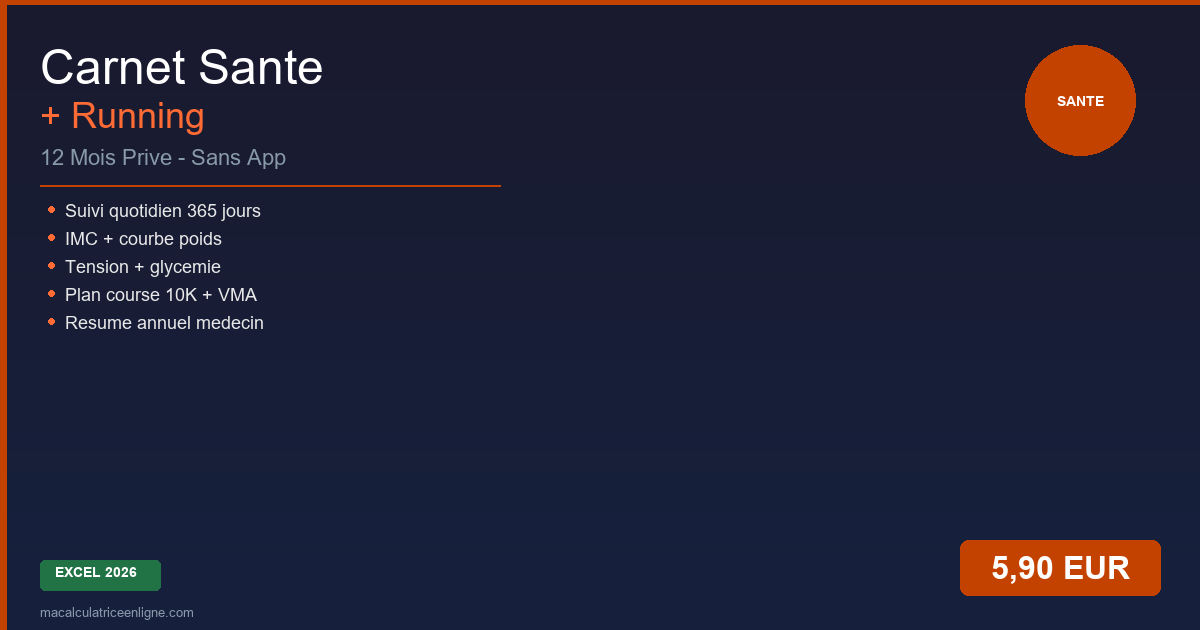 Votre carnet de santé privé sur Excel — aucune app, aucun compte, vos données restent chez vous. Suivi quotidien (poids, tension, glycémie, sommeil, humeur) avec alertes visuelles automatiques. Courbe IMC et poids sur 12 mois. Suivi tension et glycémie avec seuils OMS. Onglet activité physique avec plan course 10K 12 semaines basé sur VMA, zones d'entraînement, et volume hebdomadaire. Résumé annuel imprimable pour votre médecin.