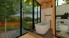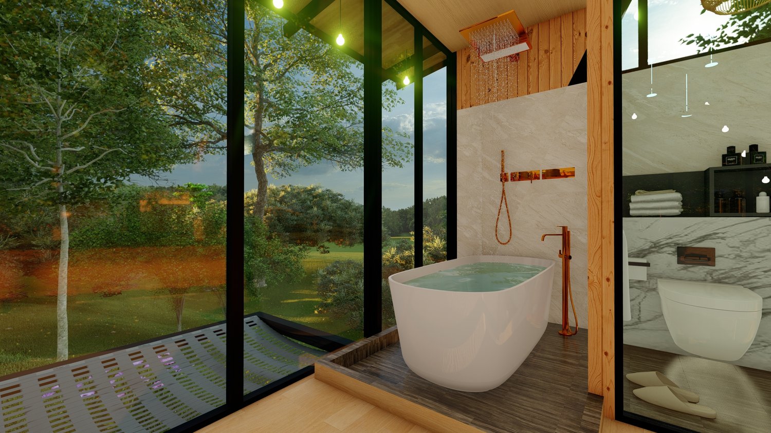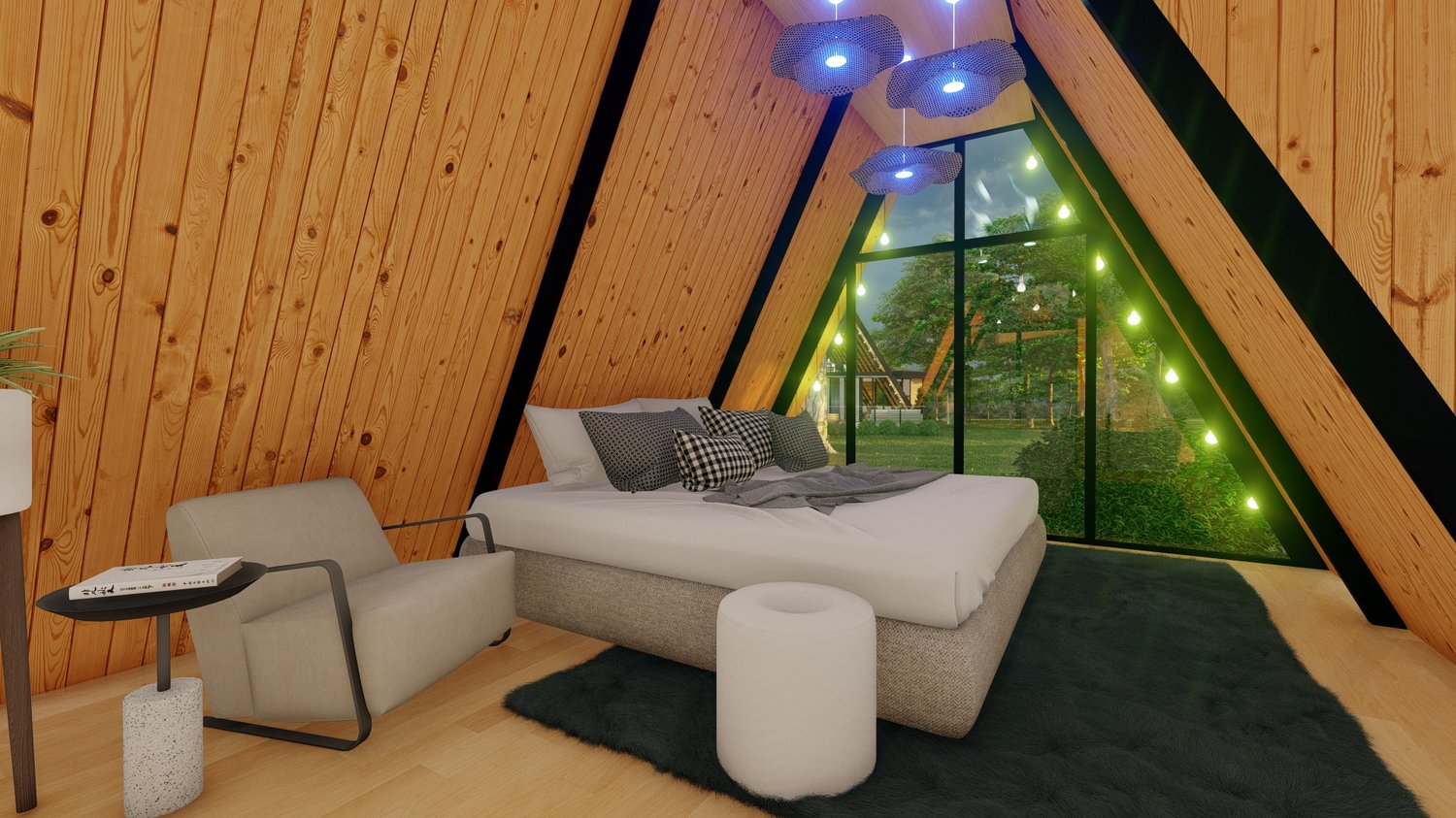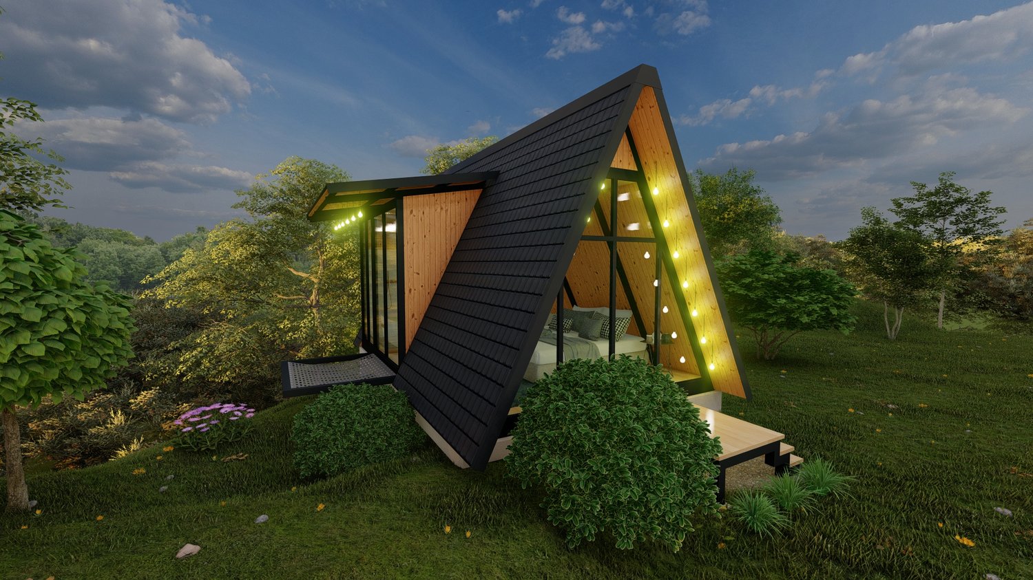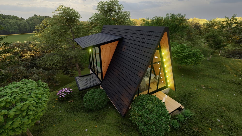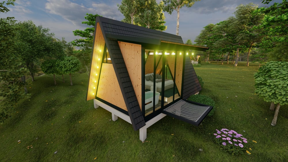 Imagina ofrecer a tus clientes una cabaña moderna, compacta, con estética A-frame extendida, vista panorámica y un interior tipo boutique.