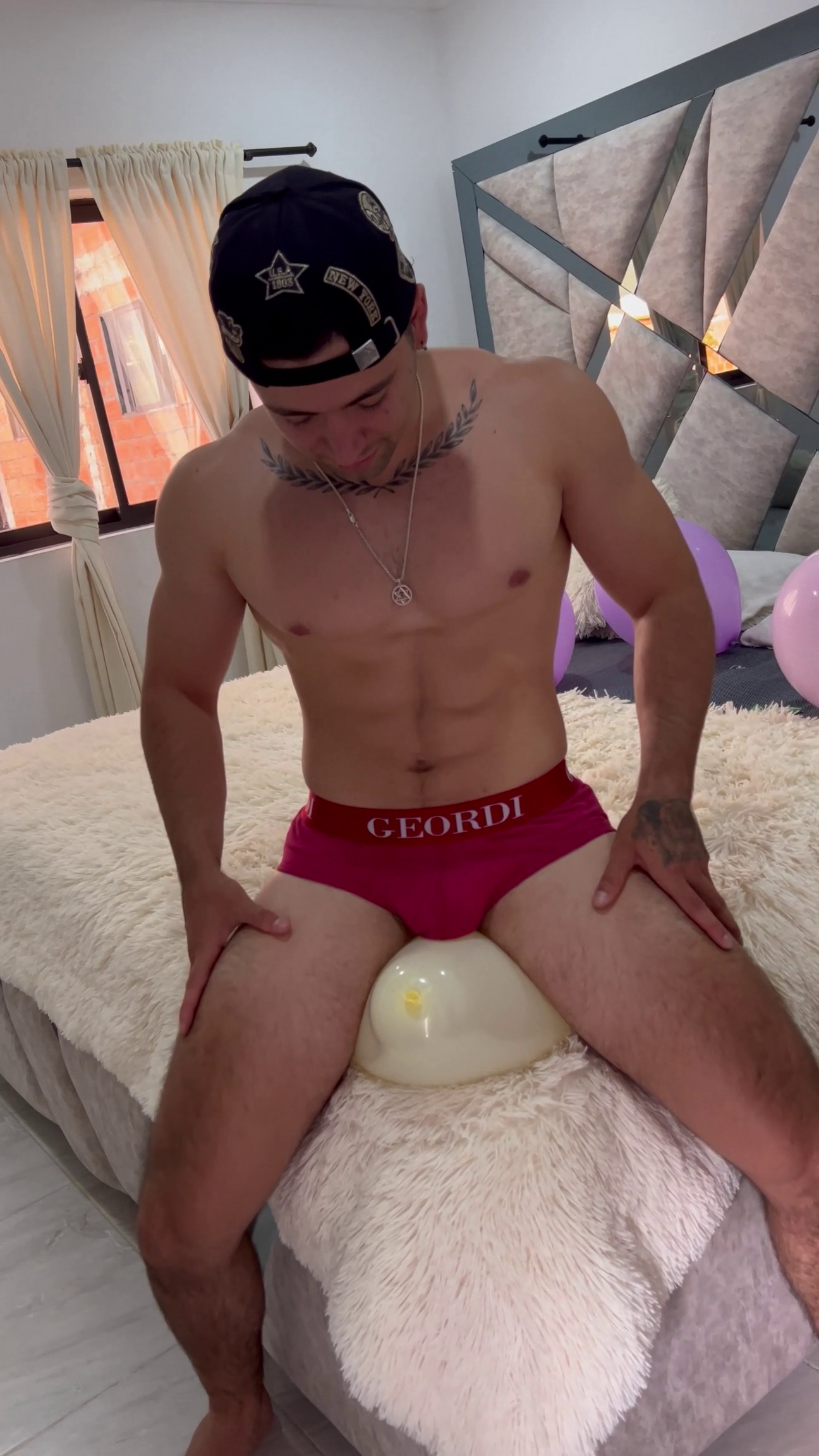 In this 10-minute and 30-second video, Simon takes playful control. Watch as he settles onto brightly colored balloons, the satisfying pops echoing with each move. He doesn't stop there—switching his focus to the floor, he then crushes others underfoot with a mischievous charm. A simple, thrilling performance of anticipation and release, captured just for you.