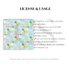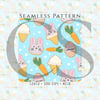 This adorable Easter-themed seamless pattern features bunny cookies, carrot treats, pastel eggs, and ice cream cones on a soft blue polka dot background. It’s designed to bring a fun, whimsical vibe to all your seasonal crafts.