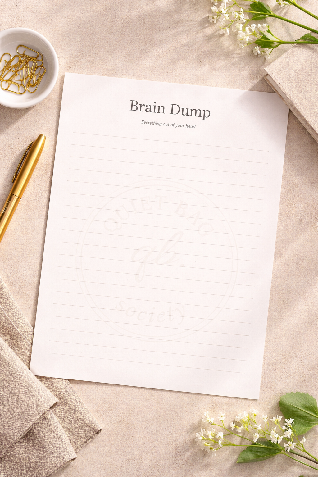 The Brain Dump page is a pressure-free space to unload thoughts, worries, ideas, reminders, and mental noise.
