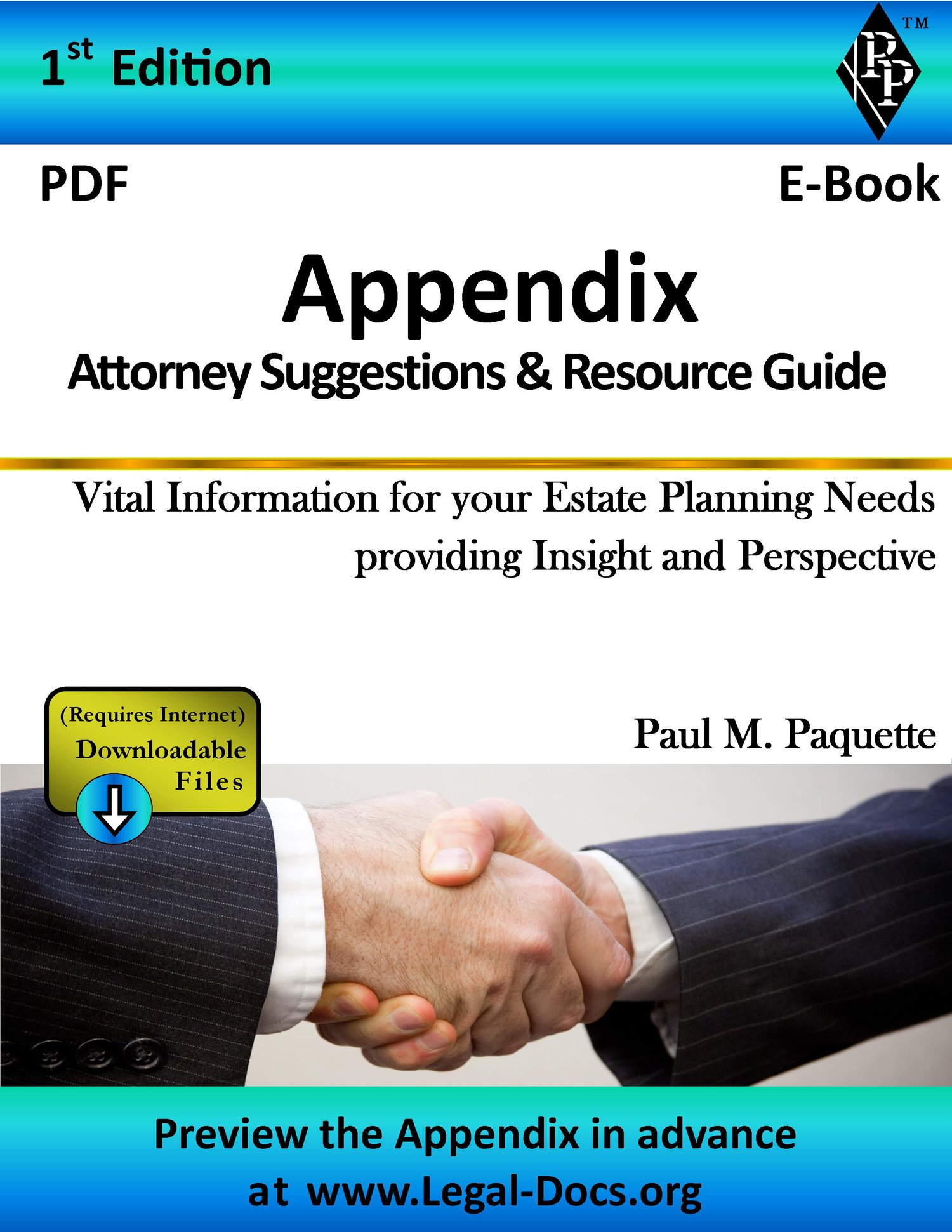 This Appendix can serve as an Addendum to any Power of Attorney ( POA ), Complex Power of Attorney ( CPOA ), Simple Power of Attorney ( SPOA ), Durable Power of Attorney ( DPOA ), Special Power of Attorney ( SPOA ), Enduring Power of Attorney ( EPA ), Lasting Power of Attorney ( LPA ) or any relevant Legal Document or Form. The Appendix has a Legal Estate Planning focus with a Practical Guide / Legal Education for Individuals that like to Do It Yourself ( DIY ) for Legal Self Help.