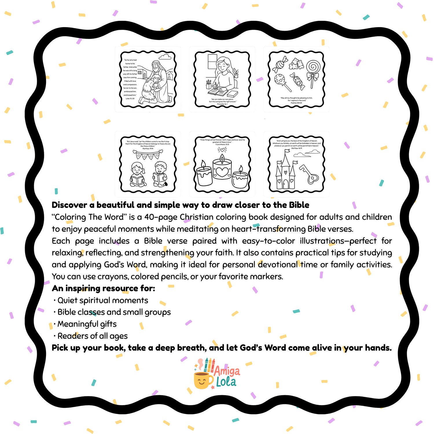 Coloring The Word is a 40-page Christian coloring book created for both adults and children who want to connect with Scripture in a creative, practical, and relaxing way. Each page features a Bible verse paired with simple, easy-to-color illustrations—perfect for beginners and anyone seeking moments of peace, reflection, and spiritual growth.