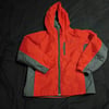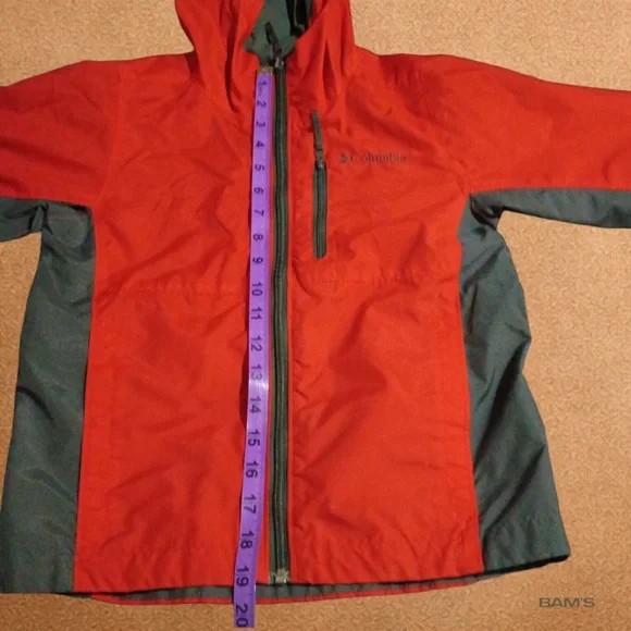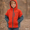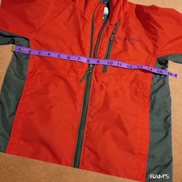 Lightweight Columbia jacket in a bold red color with teal color-block accents. Features a full zip front, attached hood, elastic cuffs, and a zippered chest pocket. Great for everyday wear, school, outdoor play, or layering in cooler weather.