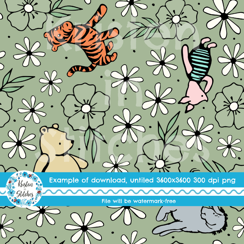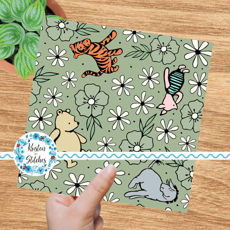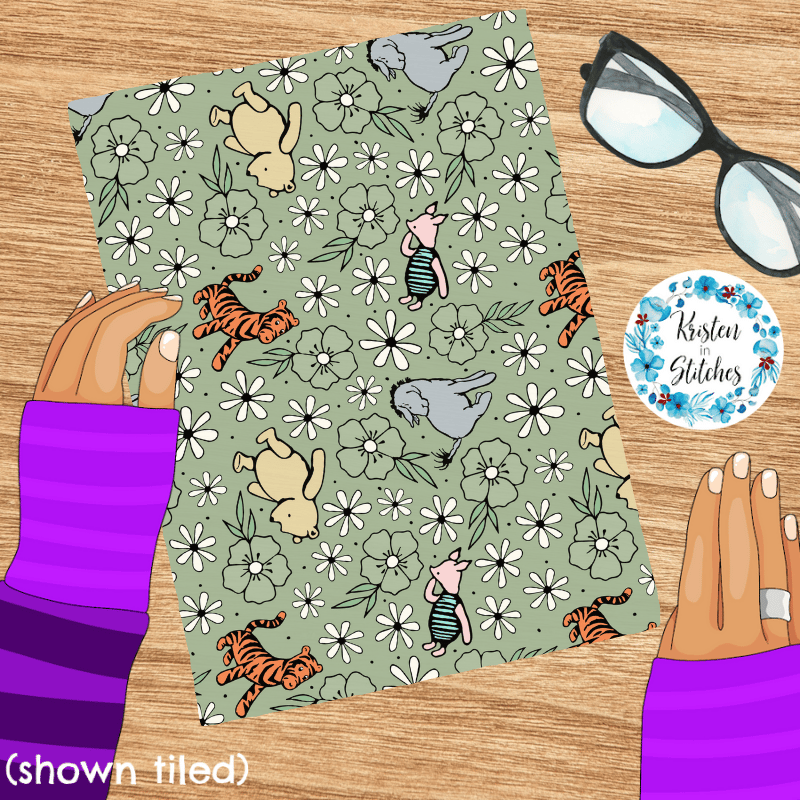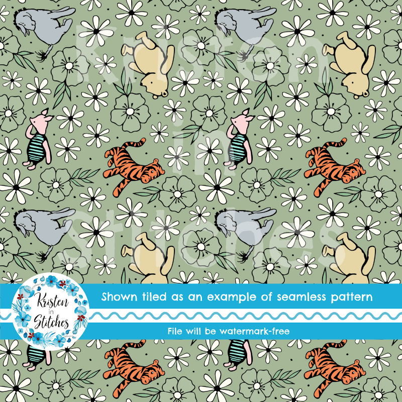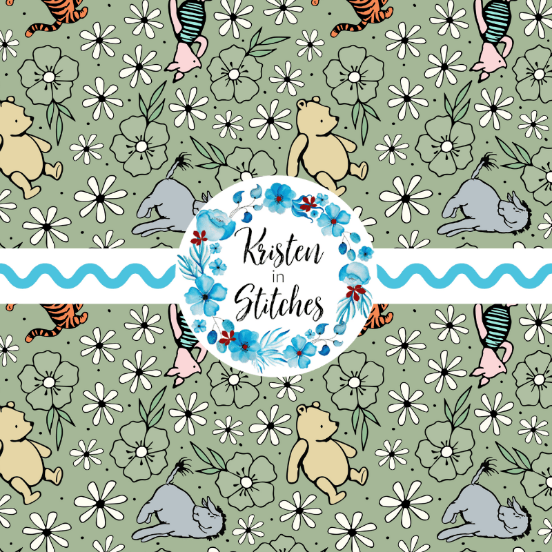 Classic Winnie the Pooh Storybook Friends Nursery Floral Seamless Pattern Sage Green