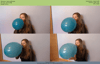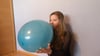 Pretty Gloria challenges herself to blow to pop a teal balloon. It keeps getting bigger and bigger until it finally pops with a satisfying bang.