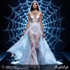 The dress features delicate patterns reminiscent of ceremonial lace, with fine, gossamer textures that catch the light. It flows gracefully, blending elegance with a touch of mystery, as if woven by nature itself. The background is softly luminous, emphasising the ethereal beauty and fragile complexity of this extraordinary spider web gown.