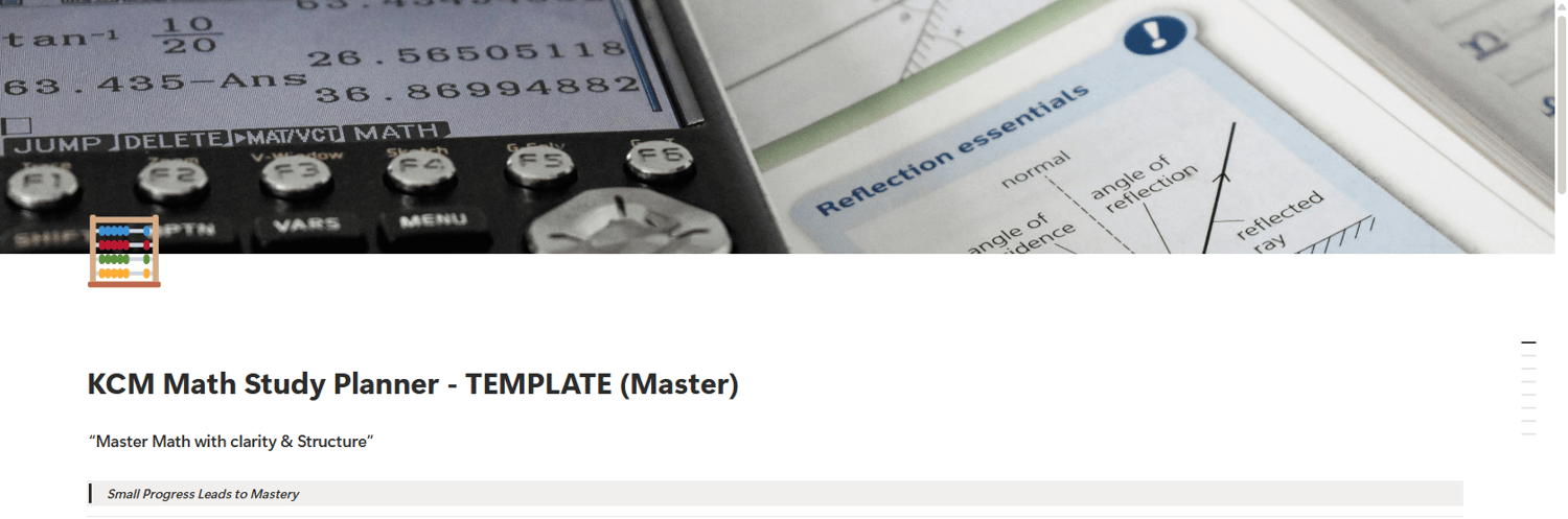 The KCM Math Study Planner is a Notion-based study system designed to help students and self-learners stay organized, focused, and consistent while studying math — without overwhelm.