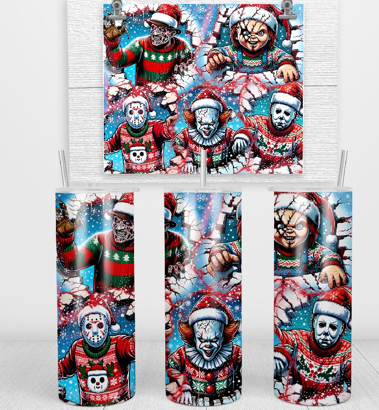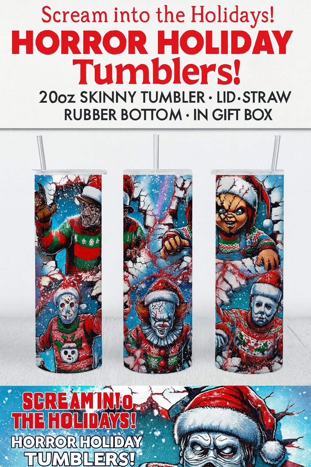 Deck the halls with dread—our 20oz Horror Holiday Skinny Tumblers are here to slay! Featuring iconic slashers like Freddy, Chucky, Jason, Pennywise, and Michael Myers dressed in festive gear, these tumblers are the perfect mix of merry and menacing.