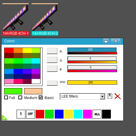 • Accesos directos a Colores Básicos: Blanco, Rojo, Verde, Azul, Amarillo, Celeste, Magenta y Blanco Full.
