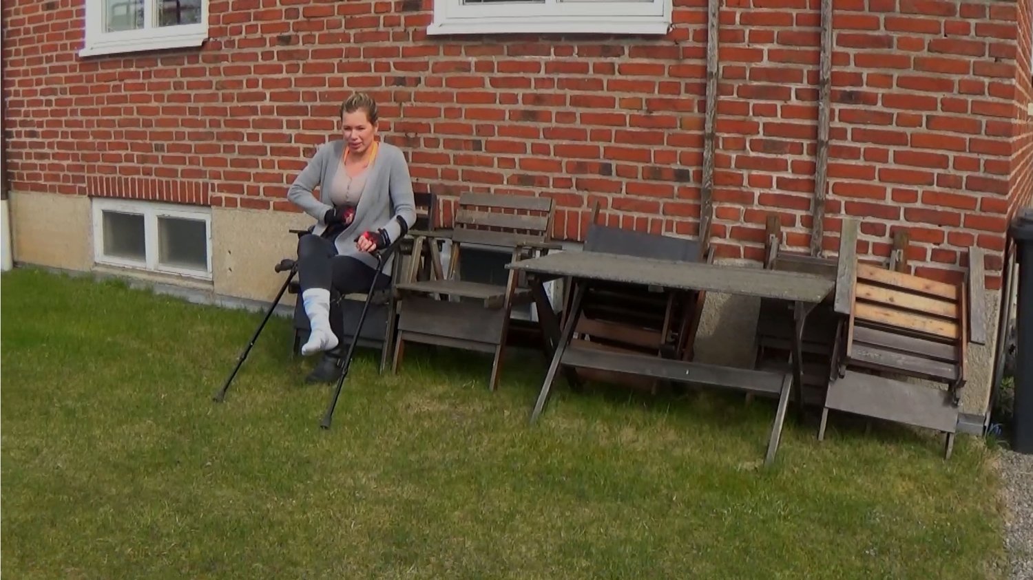 Sanne is gathering her strengths for today’s outdoor crutching with her badly sprained foot. She slowly gets up from the chair and starts to move carefully, crutching down a hill isn’t easy so Sanne decided to try and hop instead. She felt great and went on ahead and tried to walk with her injured toes as well, it looks very painful still.. maybe Sanne should stick to crutching. Poor girl.