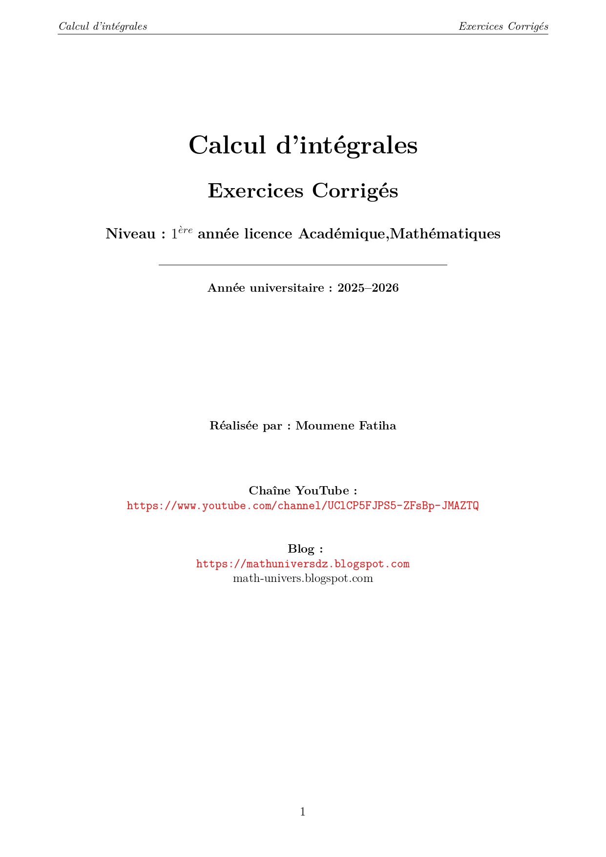 Cette série d’exercices corrigés en Calcul d’intégrales est spécialement conçue pour les étudiants de Licence 1 (Mathématiques). Elle couvre les méthodes classiques et essentielles telles que :
