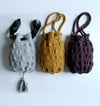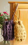 Emma’s design was inspired by the reticule handbags used by women during the 18thcentury. A knitted lining adds strength. Optional embellishments include a small pocket, duplicate stitch embroidery, and a tassel. This little bag is true luxury in the hand!