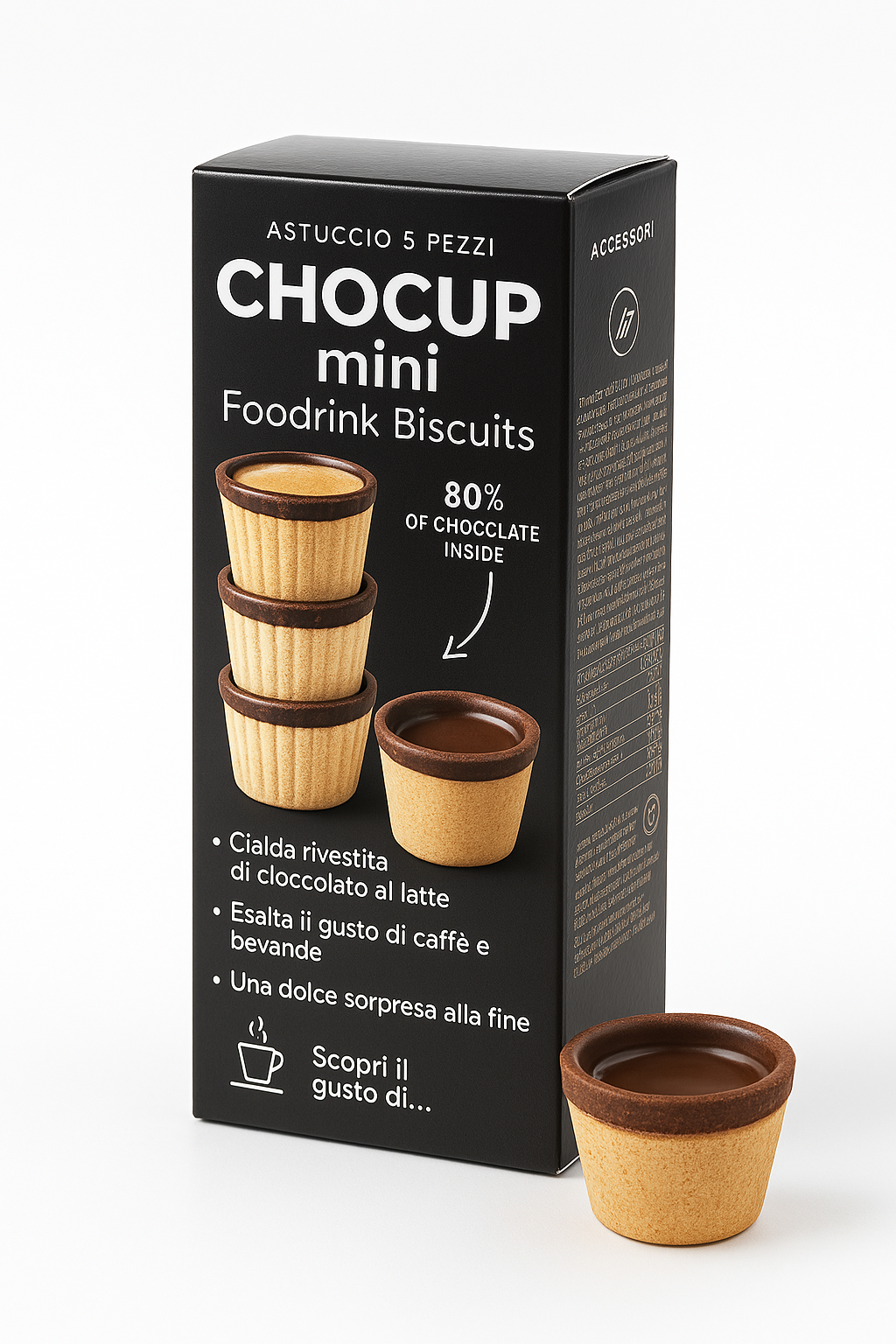 Chocup Mini è un bicchierino in cialda di wafer (tipo parigina) ricoperto internamente di cioccolato fondente belga al 60%, pensato per contenere bevande calde o fredde e consumarsi interamente dopo l’uso.