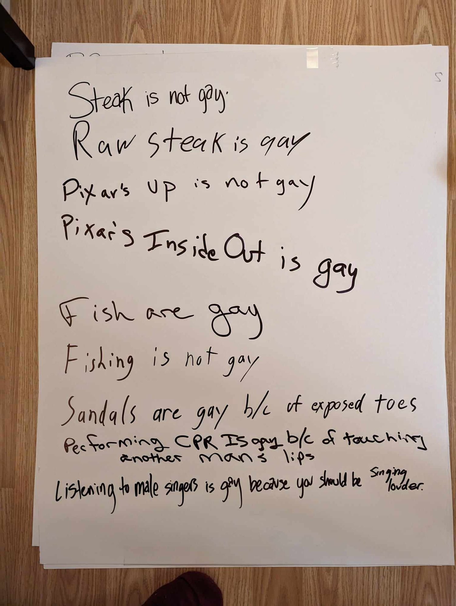 What does gay mean? Are we talking about gay men, the 2SLGBTQ+ community as a whole, or something in between? All three of those are valid colloquial definitions, however a big part of the ridiculousness of the game lies in refusing to define what we mean. When you feel the urge to add nuance, don’t.