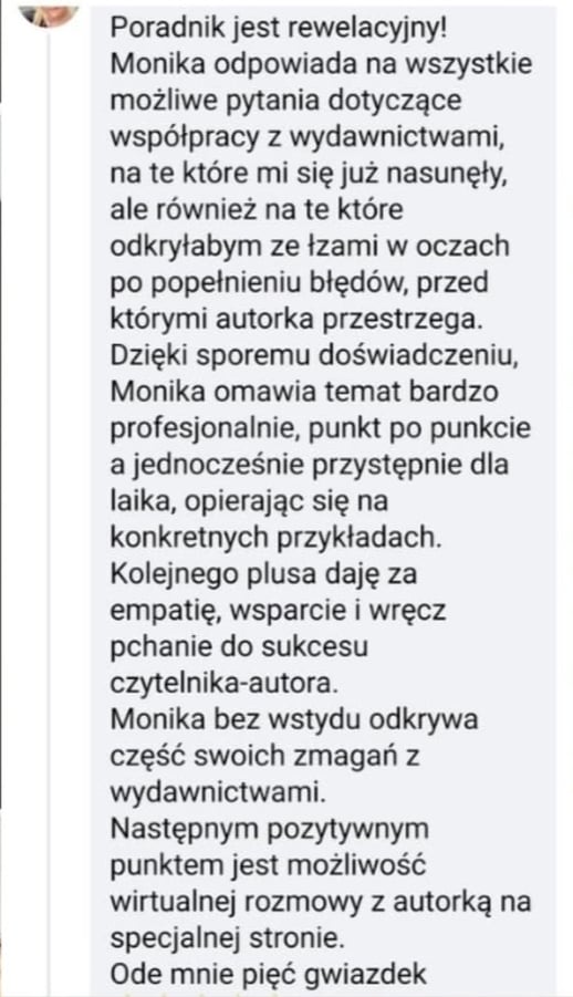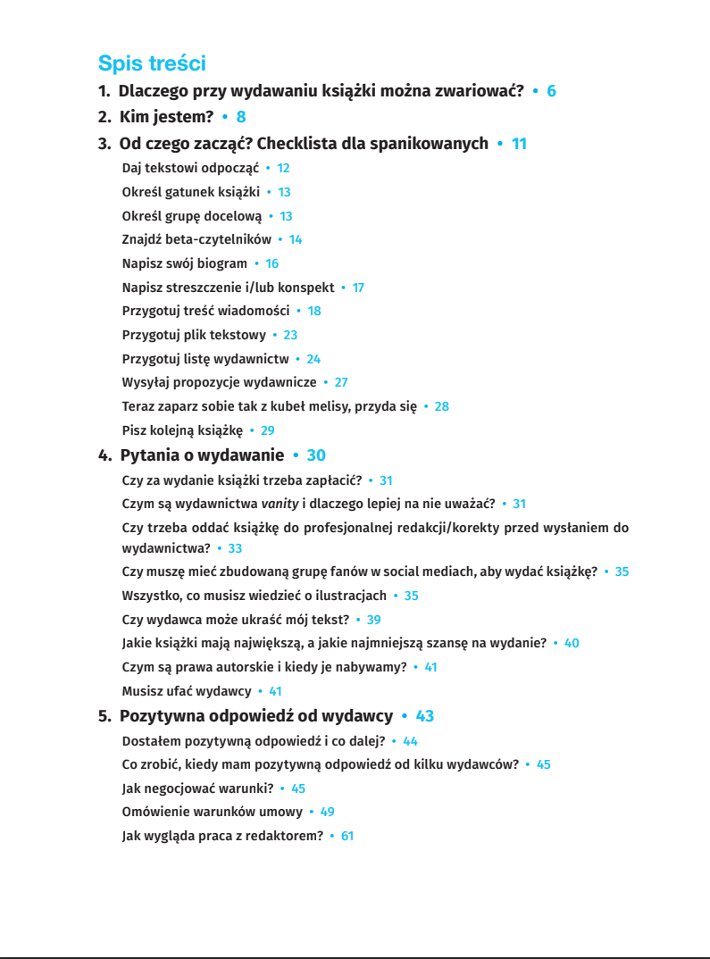 Ponadto znajdziesz w nim odpowiedzi na najbardziej nurtujące pytania, m.in. czy na pisaniu można zarobić, czy potrzebujesz redakcji przed wysłaniem tekstu do wydawców, czy musisz mieć zbudowaną grupę fanów przed wydaniem książki, jak autor rozlicza się z podatku i wiele innych.