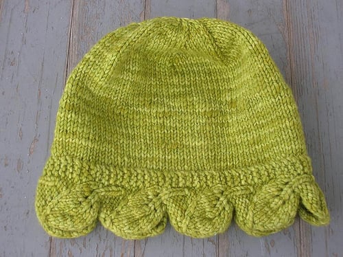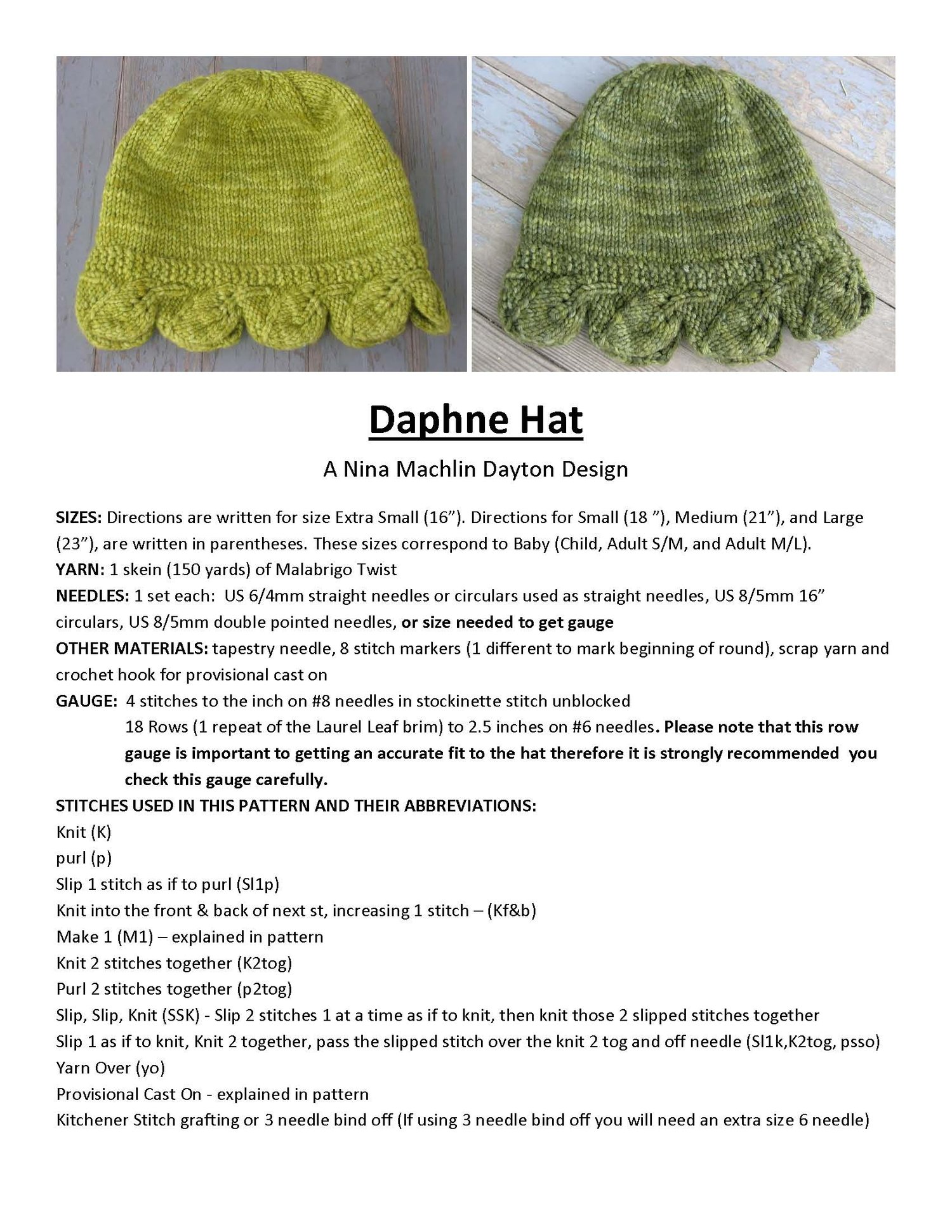 Pattern includes 4 sizes ranging from Baby to Adult Large, charted and written instructions for the Laurel Leaf Brim, and has the options to increase “slouch” if desired.